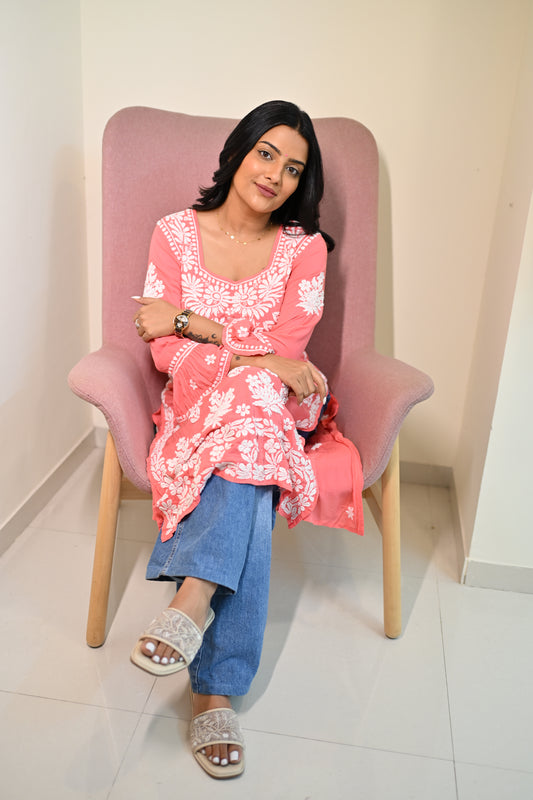 Aarohi Handwoven Chikankari Coral Pink Long Kurta 100% Modal