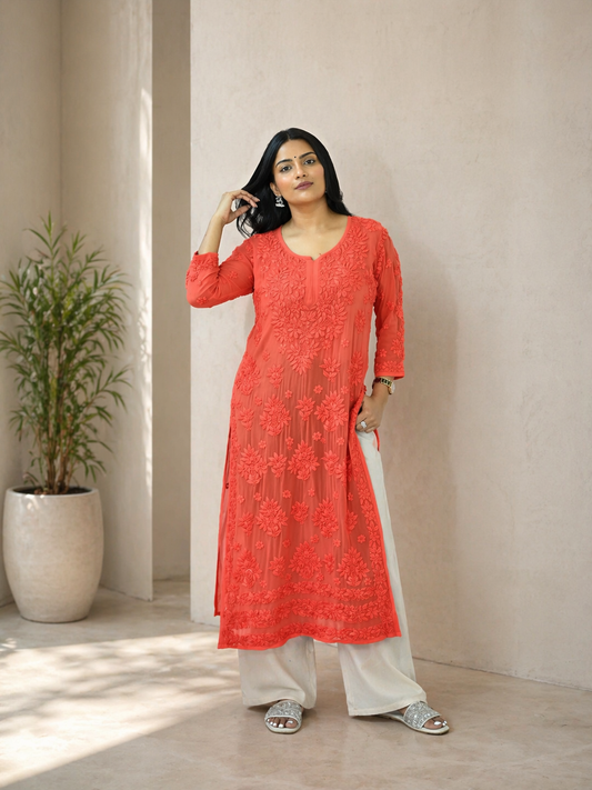 Aaradhya Handwoven Chikankari Deep Orange Long Kurta 100% Viscose