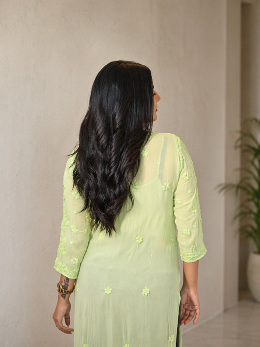 Aaradhya Handwoven Chikankari Lime Green Long Kurta 100% Viscose