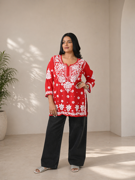 Aahana Handwoven Chikankari Vibrant Red Short Kurta 100% Modal