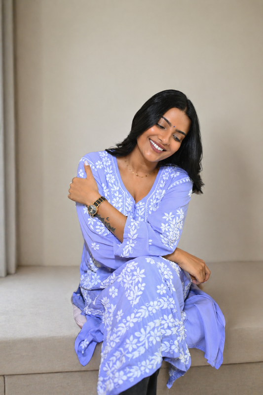 Aishwarya Handwoven Chikankari Lavender Long Kurta 100% Modal