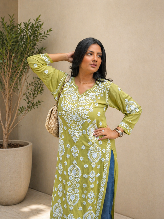 Aarohi Handwoven Chikankari Lime Green Long Kurta 100% Modal