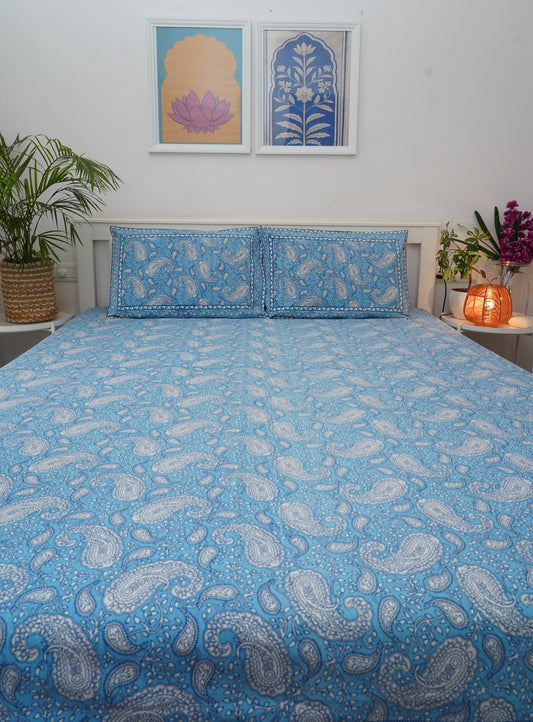 Nucifera- White & Blue King Size 100% Cotton Handblock Print Bedsheet