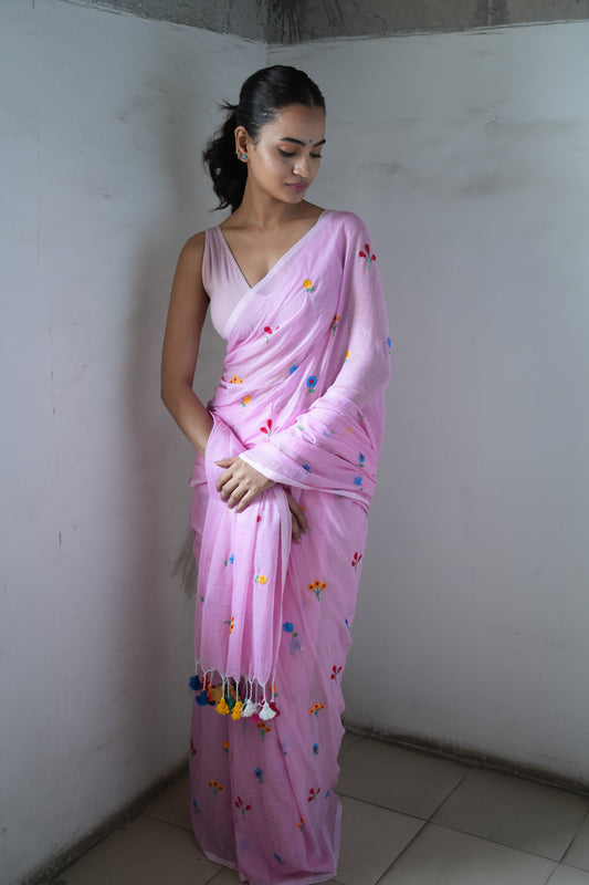 Pastel Pink Rang Birange Phool Embroidered Mul Cotton saree
