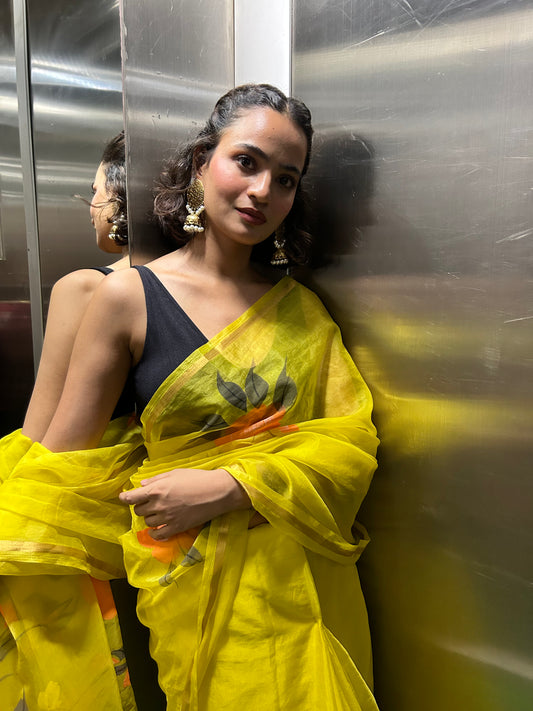 Bright Yellow Organza Handpainted Saree