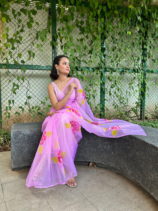 Neon Pink Organza Handpainted Saree
