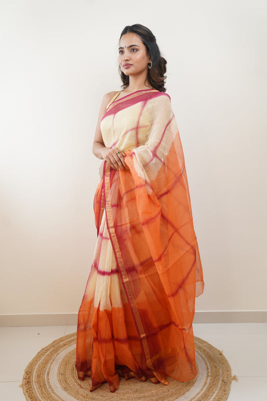 Black and Rustic Red Kota Doria Handblock Print Saree