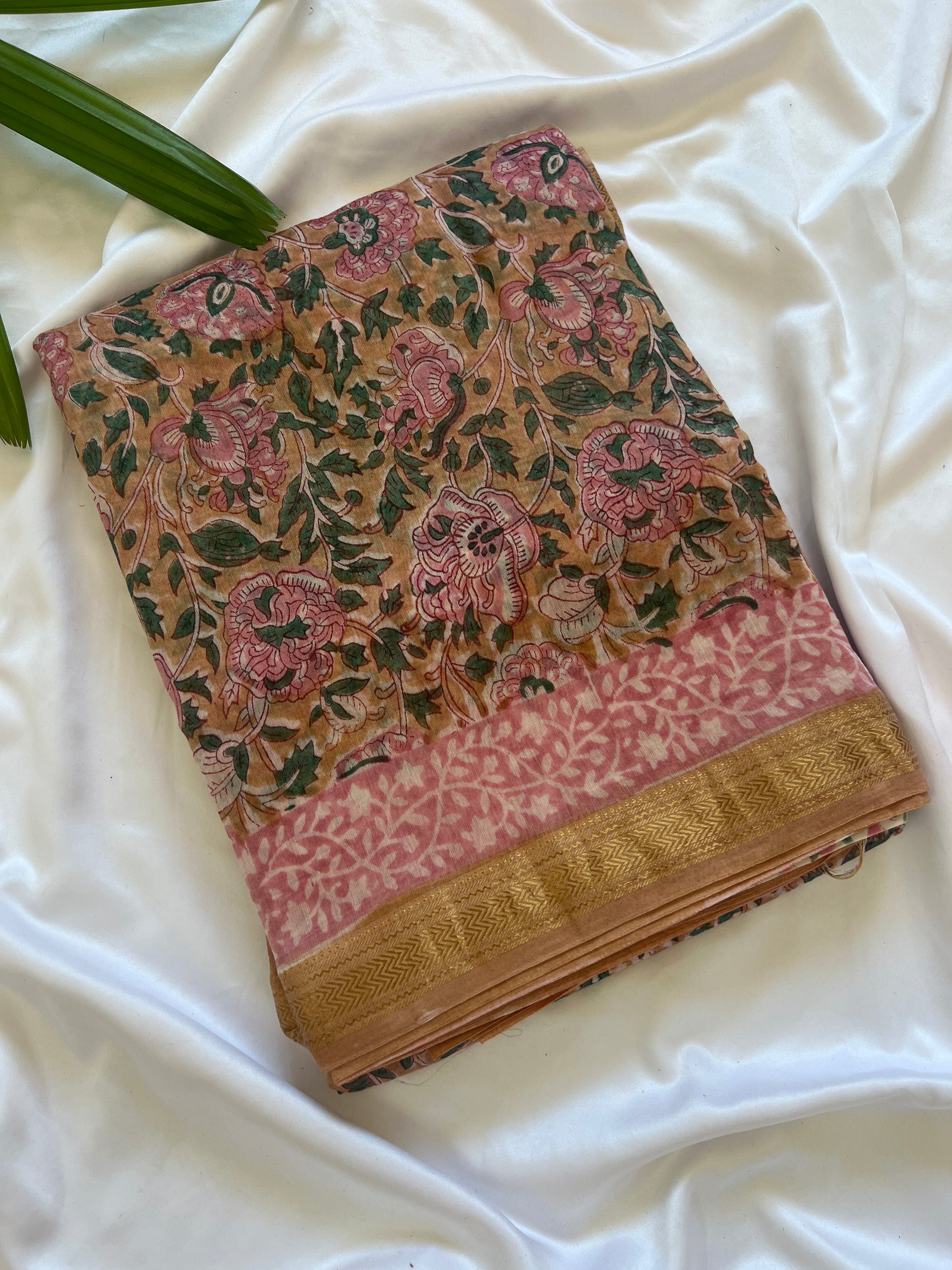 Discover timeless elegance with our Beige & Baby Pink Maheshwari Cotton Silk Saree. Crafted in luxurious Maheshwari Cotton Silk fabric, its versatile length of 5.5 meters ensures graceful draping, complemented by a perfect height of 45 inches with the included blouse. The intricate handblock prints on the canvas adds a touch of sophistication, making this saree a statement piece for every occasion. Paired with a complementary blouse, it seamlessly blends tradition with contemporary style, offering a refined and chic ensemble. Elevate your wardrobe with this exquisite saree that captures the essence of modern sophistication.