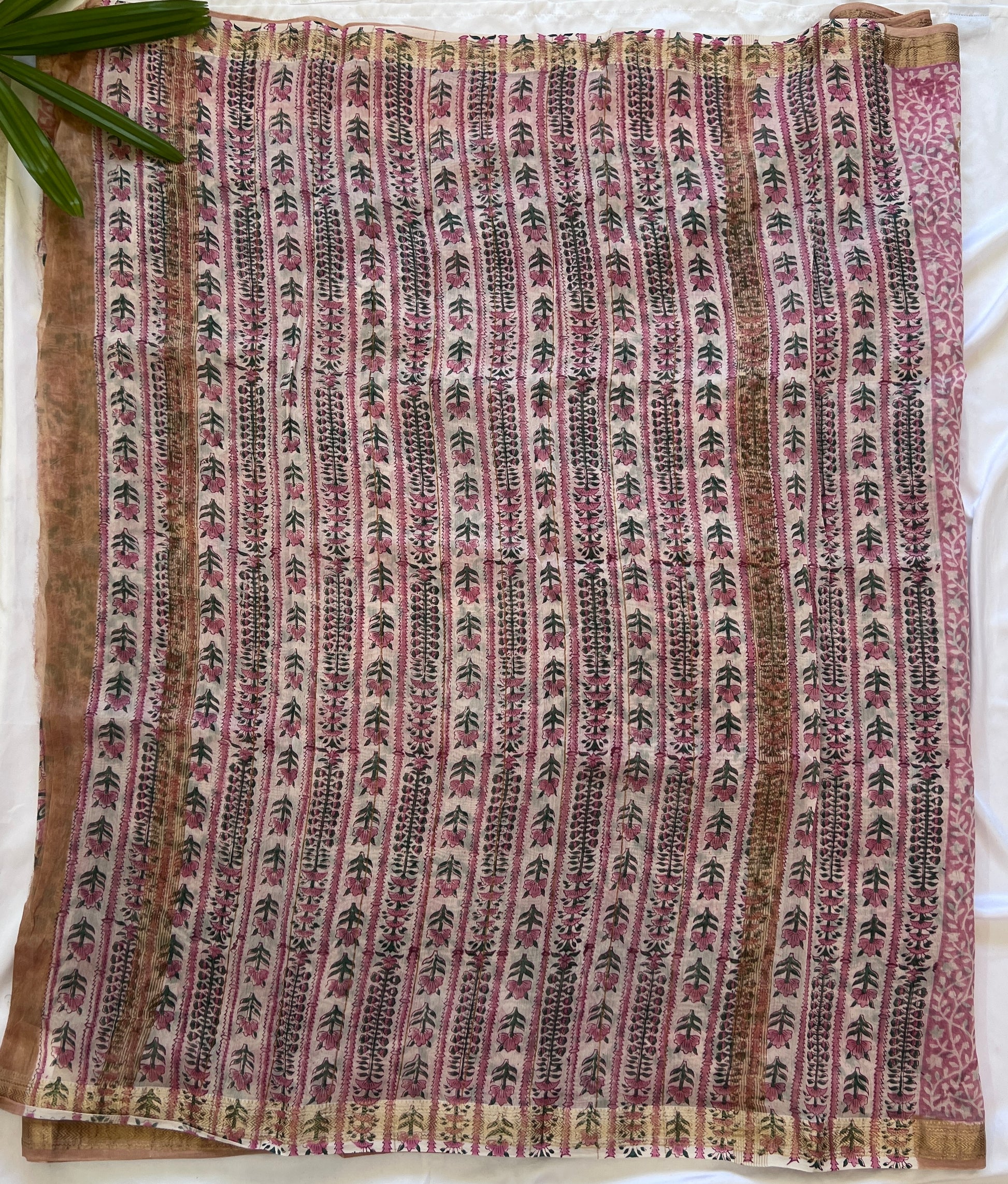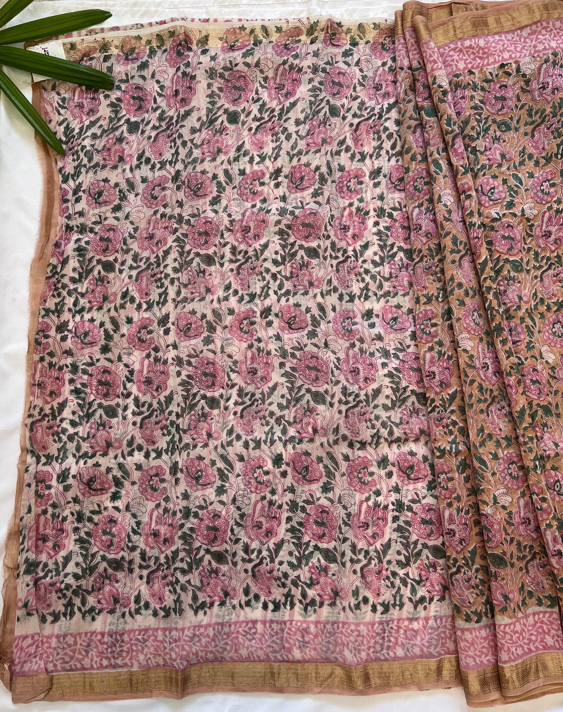 Note: It's a handblock printed saree all done by artisans. There might be slight irregularities in the print, motif, or colour. These are not defects, it's the nature of handicraft products.