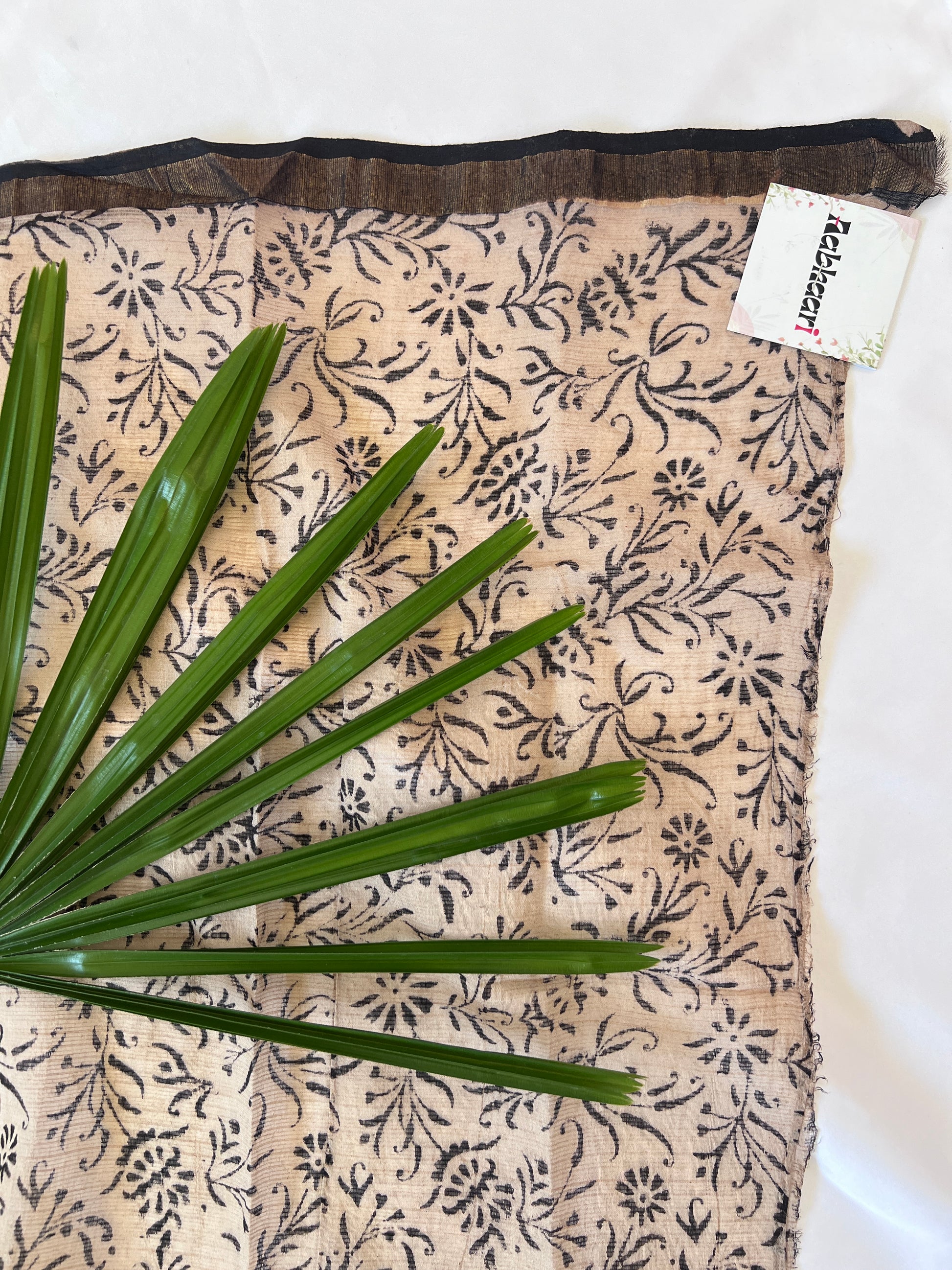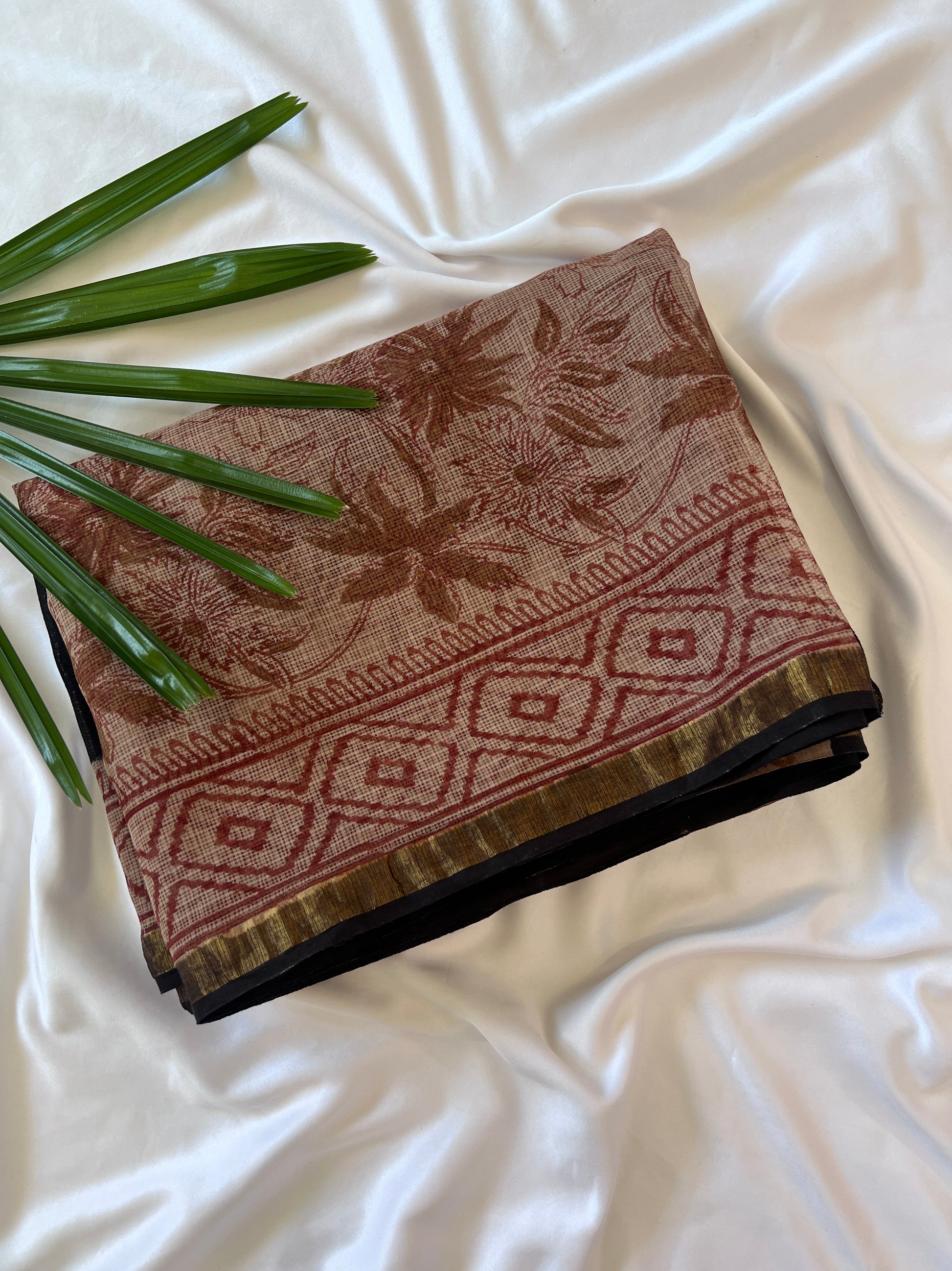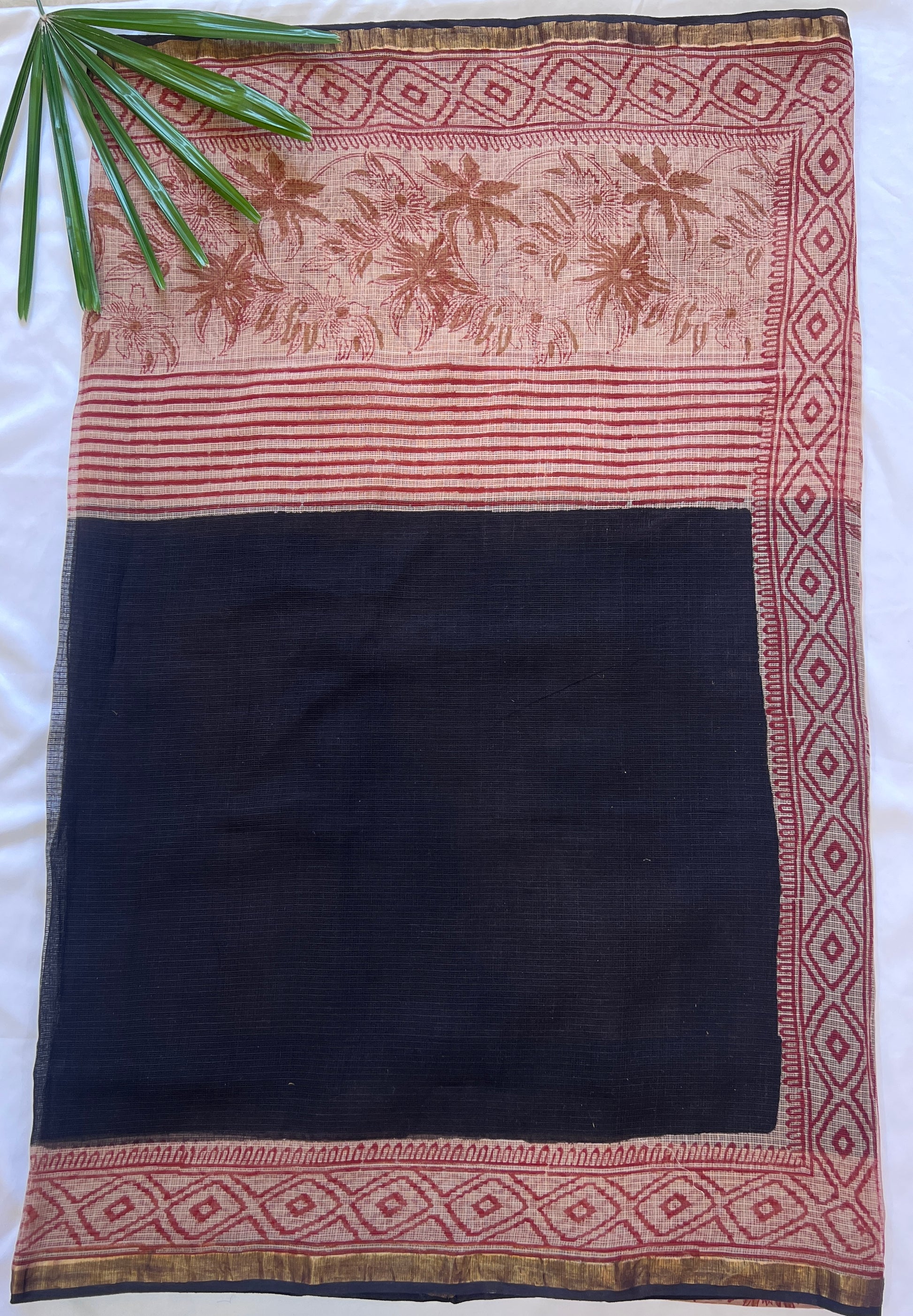 Black and Rustic Red Kota Doria Handblock Print Saree