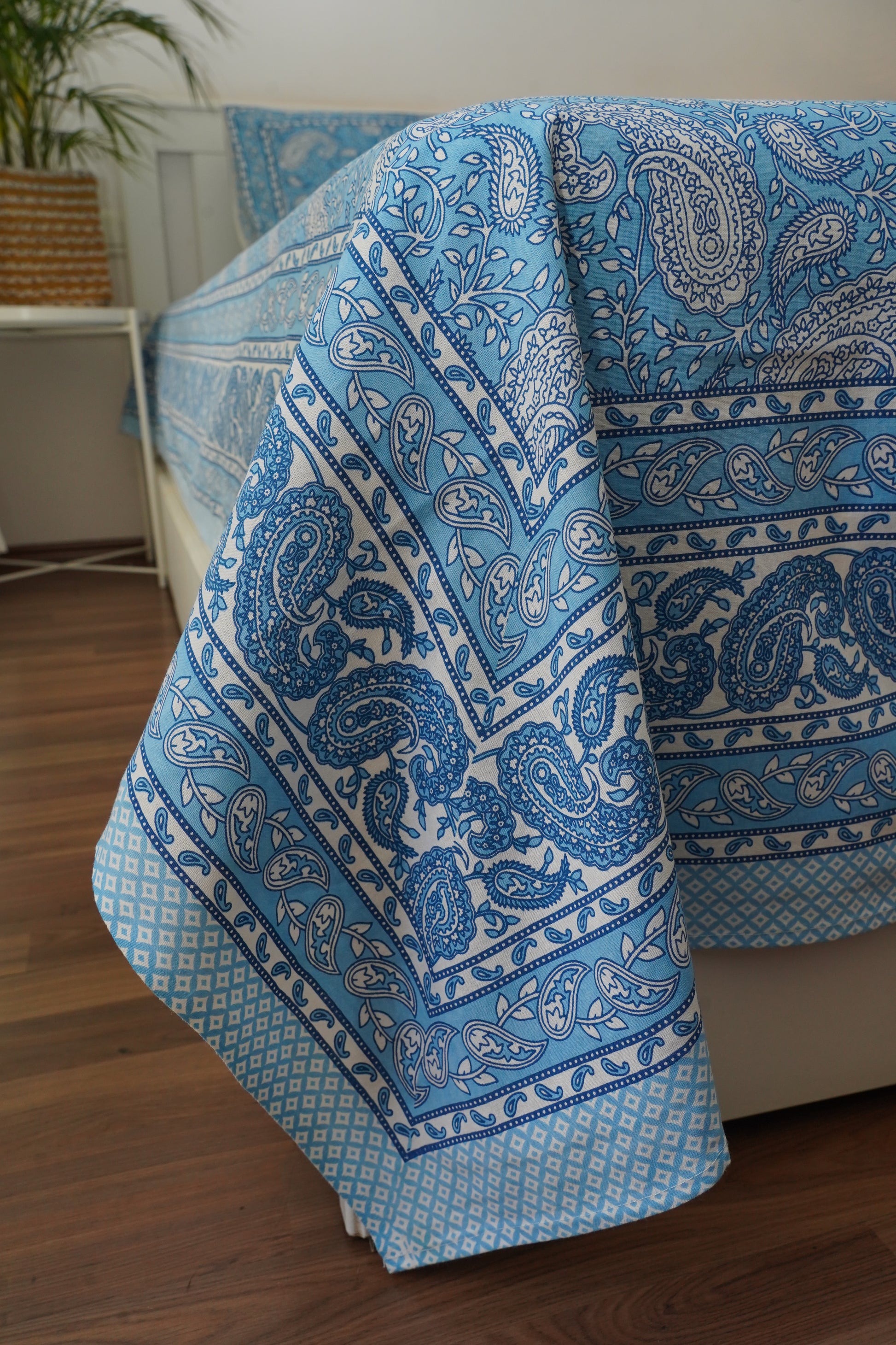 It's a handblock printed bedsheet all done by artisans. There might be slight irregularities in the print, motif, or colour. These are not defects, it's the nature of handicraft products.