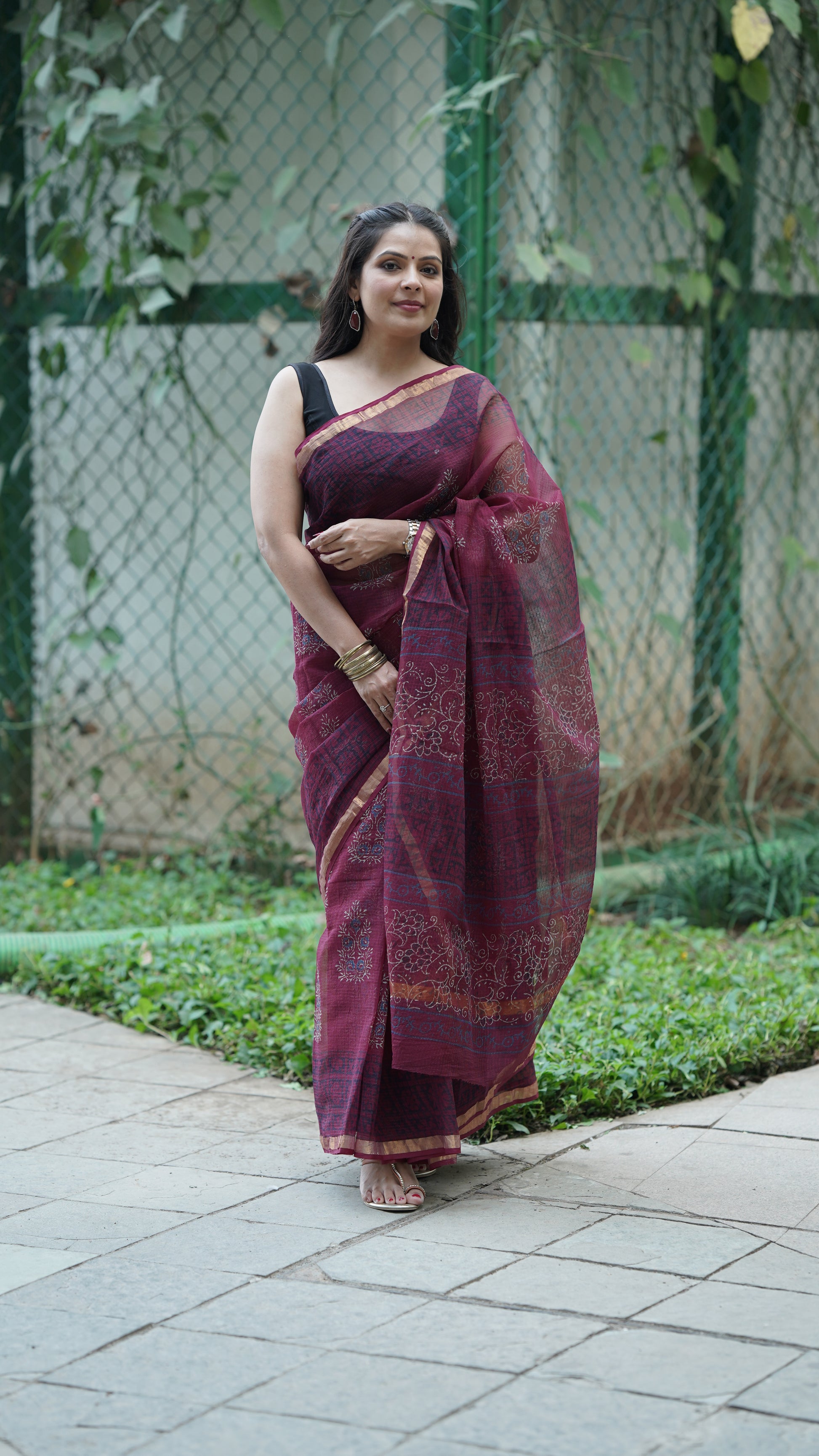 Burnt Burgundy Handblock Print Kota Doria Saree