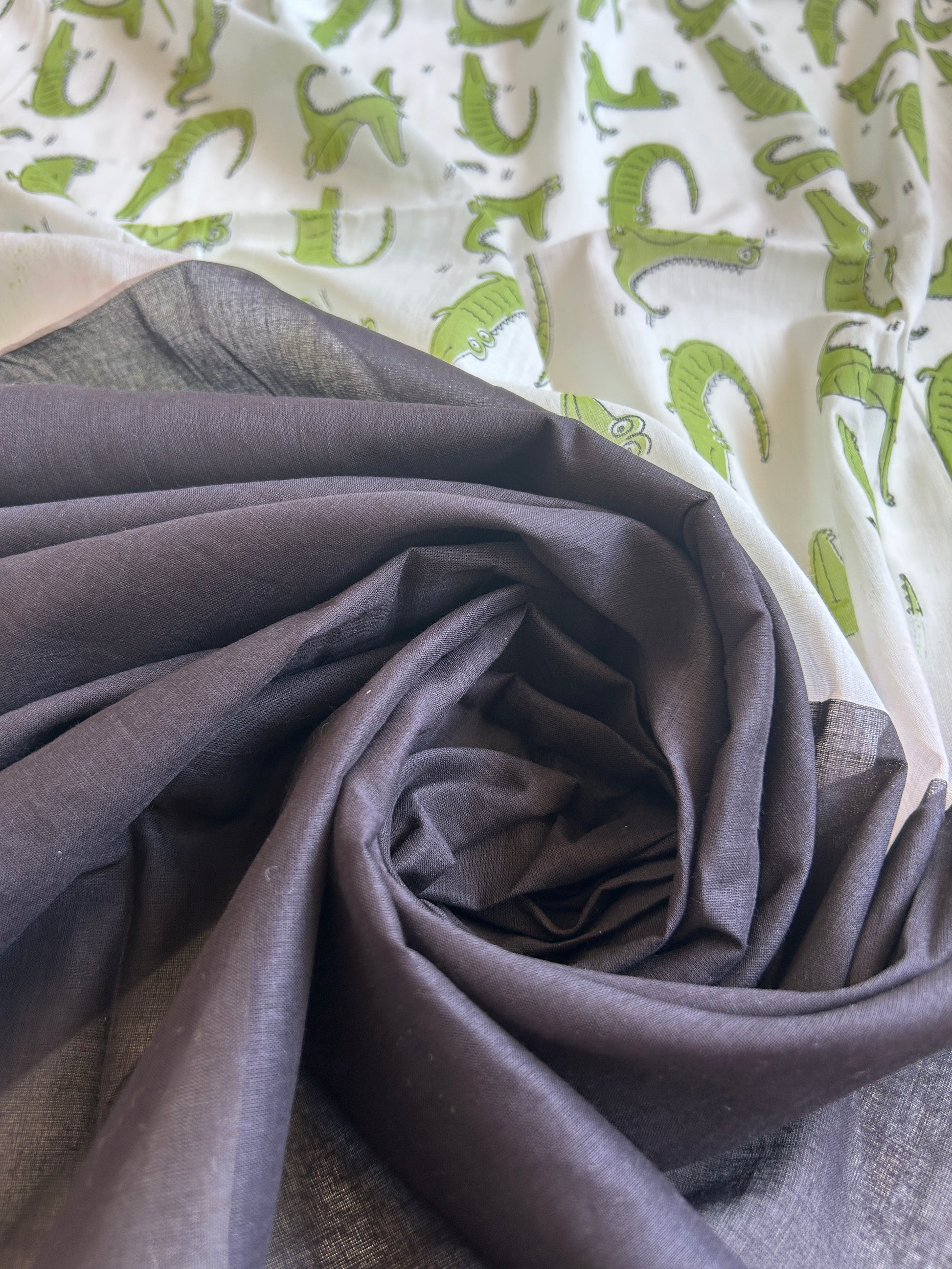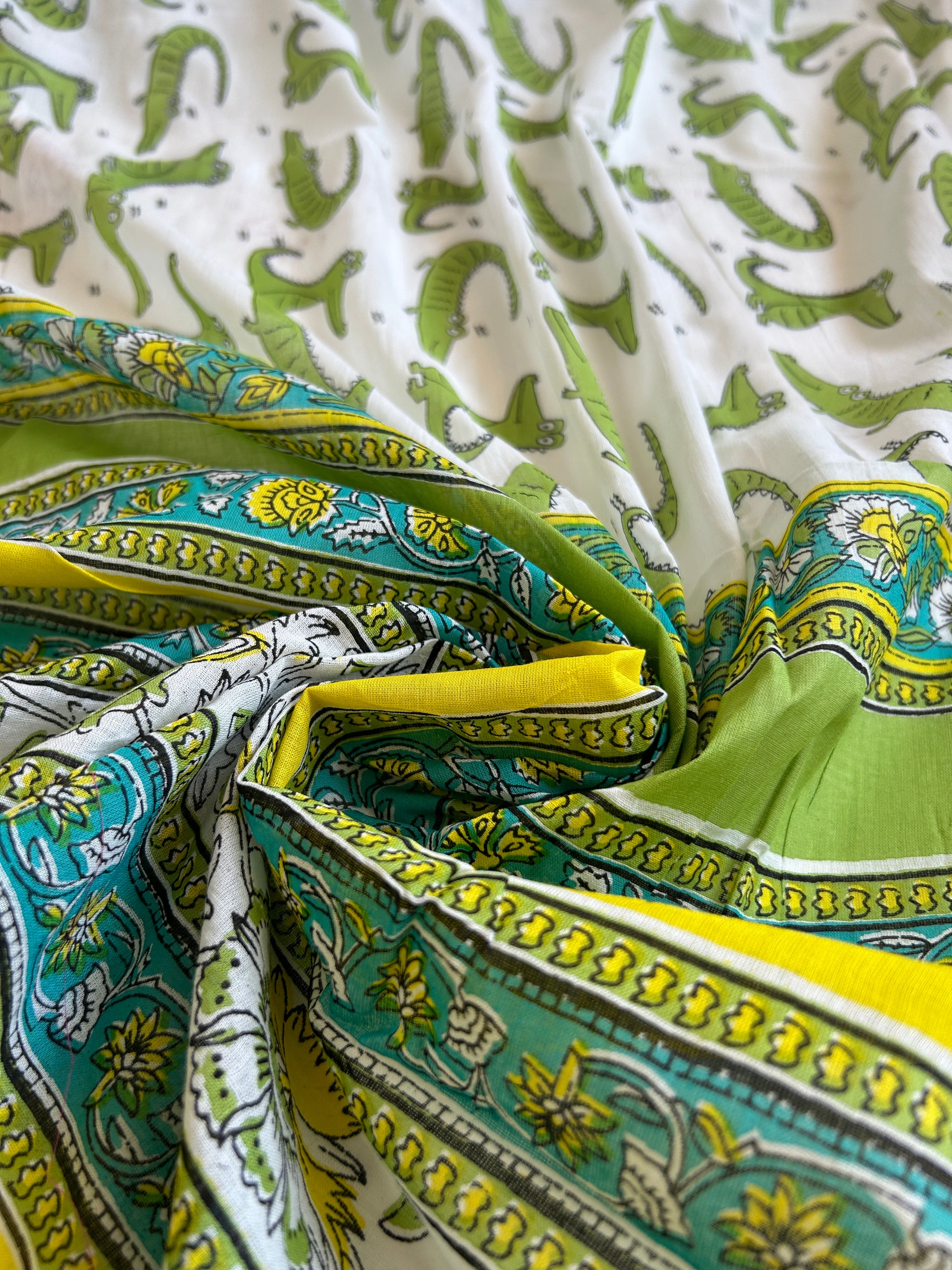 Wrap yourself in the delicate charm of our Cheeky Crocodile Saree, a fusion of tradition and contemporary elegance. Woven from the finest Mul Cotton, this saree stands at 45 inches, promising a lightweight and graceful drape. The Handblock Print, intricately designed, adds a touch of artisanal charm, creating a visual symphony on the fabric. With a length of 5.4 meters, the saree unfolds a tale of timeless sophistication. Paired with a 80cm blouse, this ensemble is a celebration of seamless beauty and style. Care for this piece with a gentle handwash using cold water and mild detergent, preserving its pristine allure. Join our exclusive group and immerse yourself in the enduring charm of this resplendent creation.