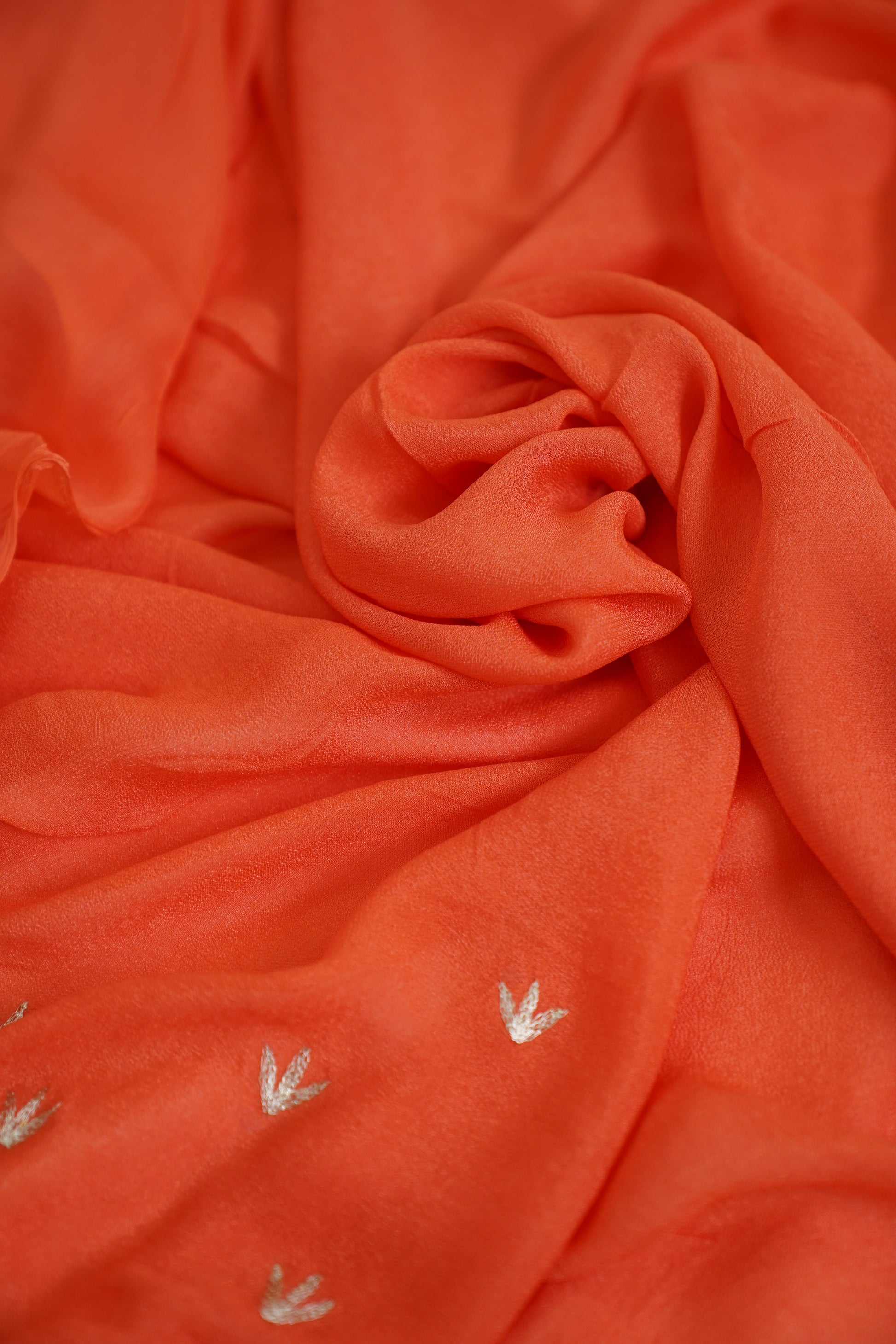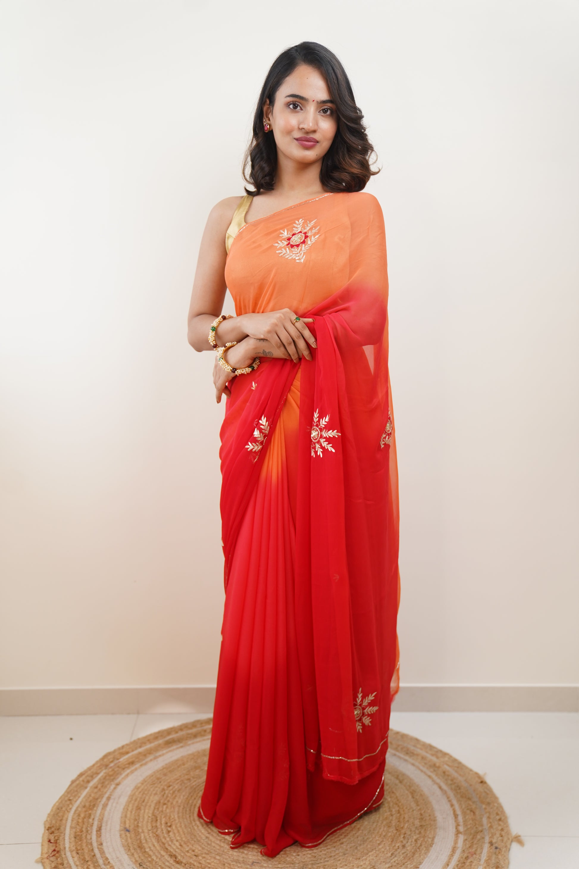 Coral and Scarlet Red Ombre Pure Chiffon Embroidered Saree