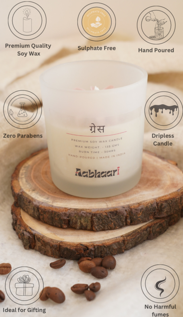 Introducing Grace, a captivating fragrance designed for creating a cozy ambiance in living rooms, bedrooms, or study spaces. This candle has comforting top notes of Sandalwood and premium Guaiacwood, middle notes of Lavender, and a hint of Cinnamon as the end note.The warm embrace of Sandalwood and the subtle spice of Cinnamon provide a comforting feel, while Lavender adds a touch of tranquility. Illuminate your moments with this enchanting fragrance, creating a sanctuary of tranquility and elegance.
