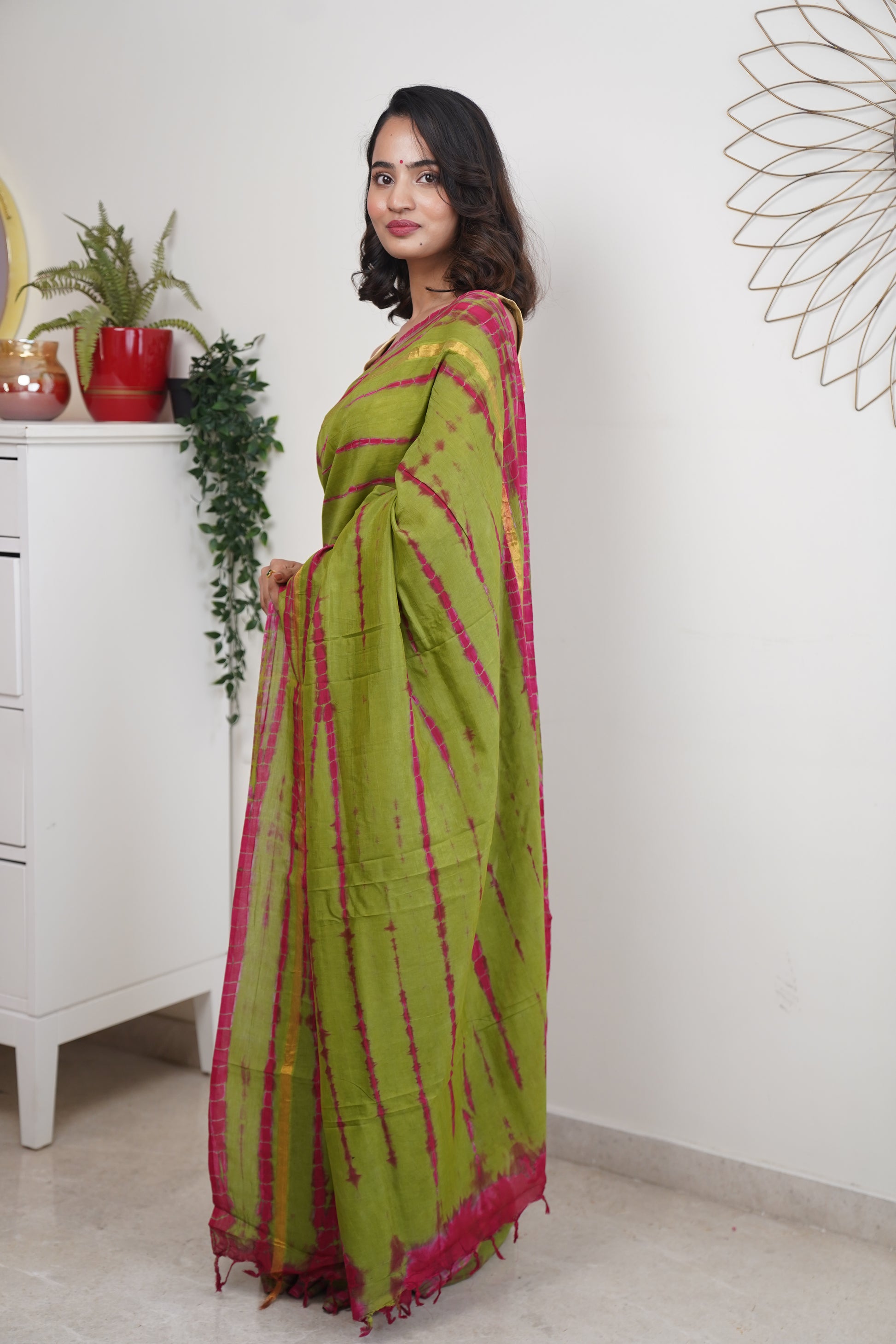 Green & Pink Assam Silk and Cotton Tie & Dye Pattern Saree