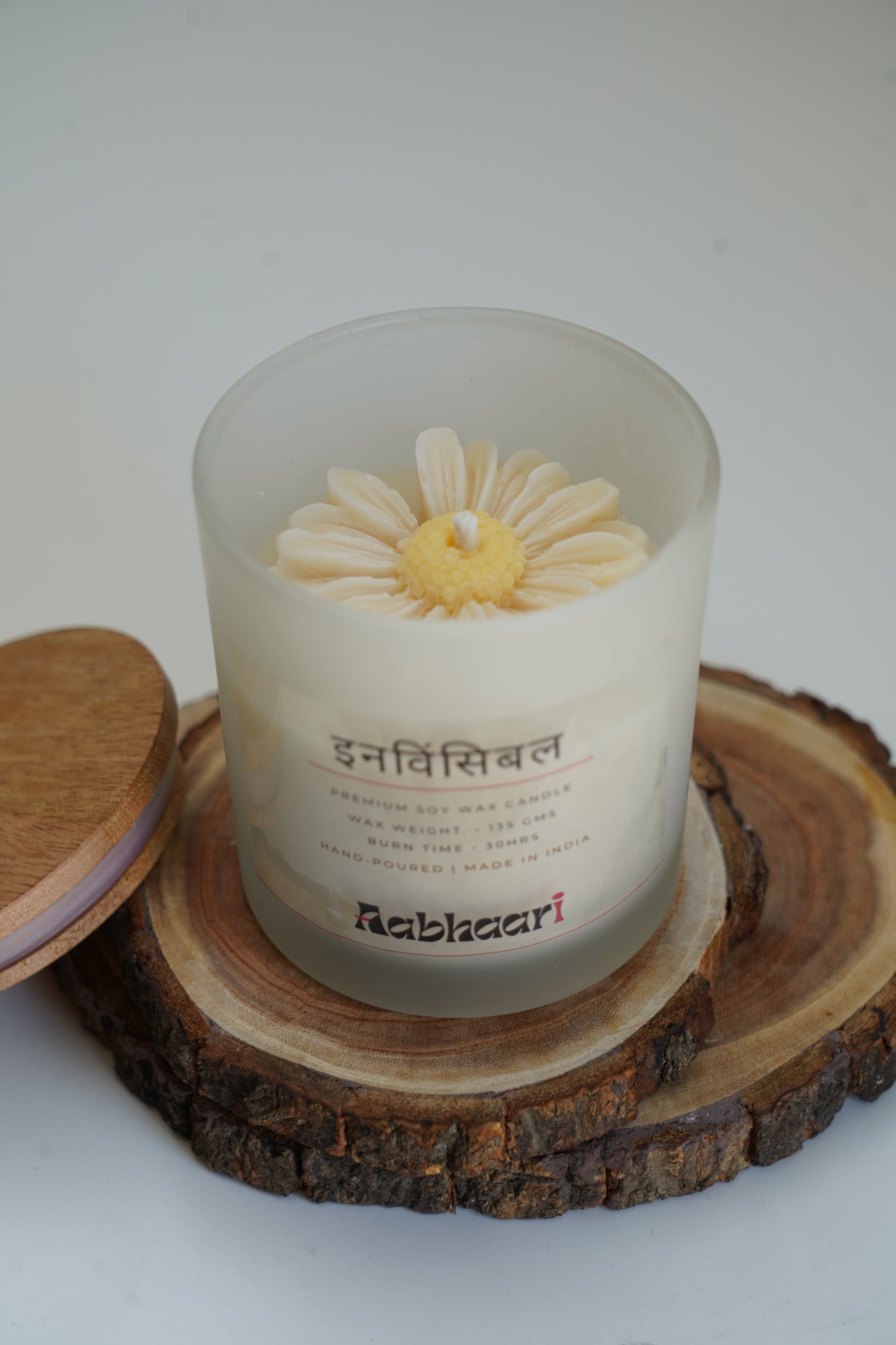 This candle is topped with a beautiful scented beige flower accent to enhance the beauty of your home.