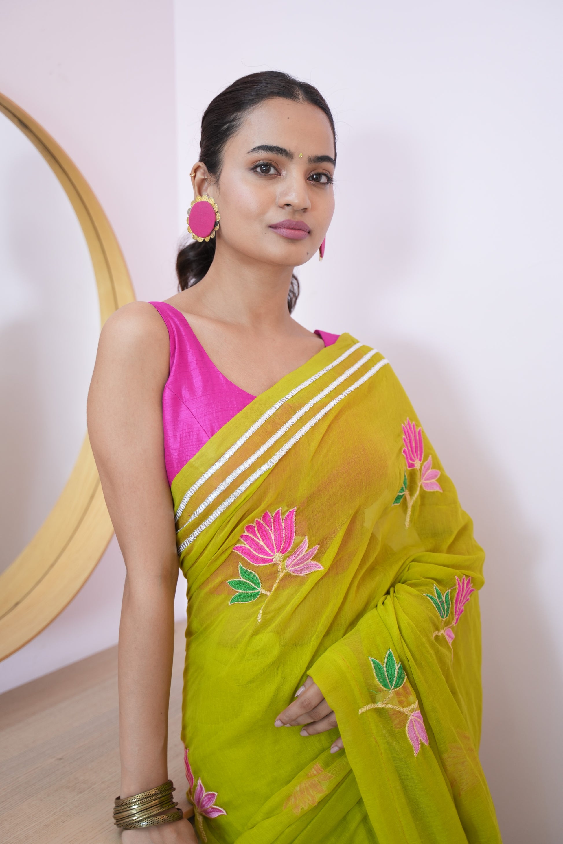 Lime Green Lotus Bloom Embroidered Mul Cotton Saree