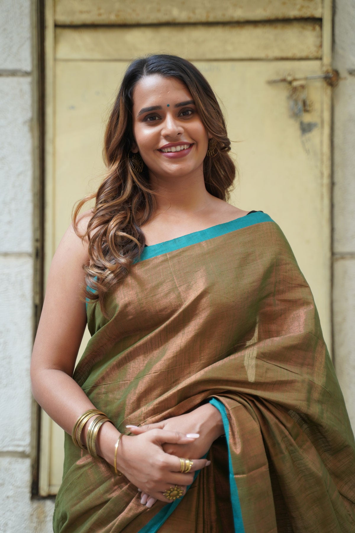 Metallic Copper Khadi Tissue with Dynasty Green Border Saree