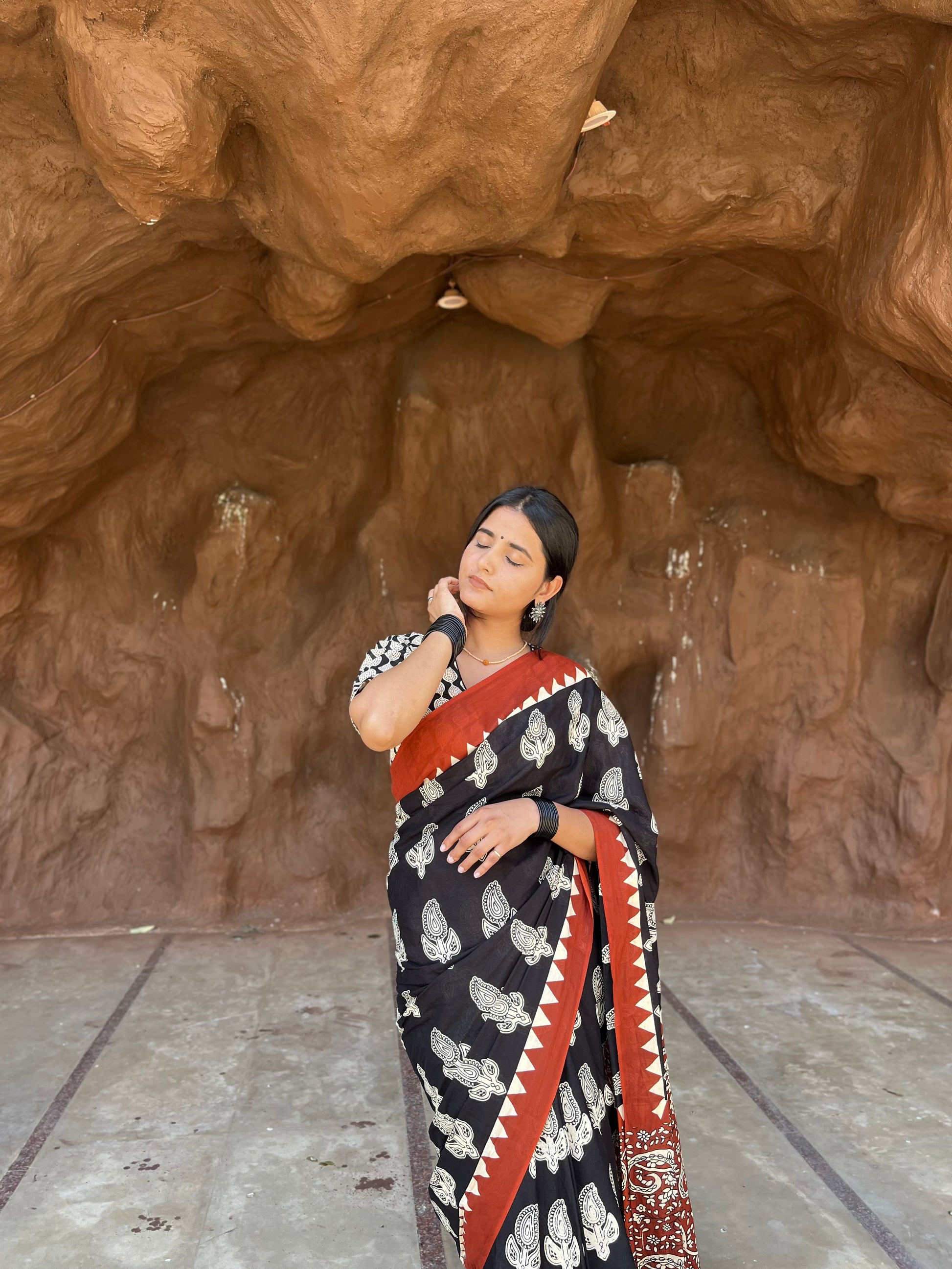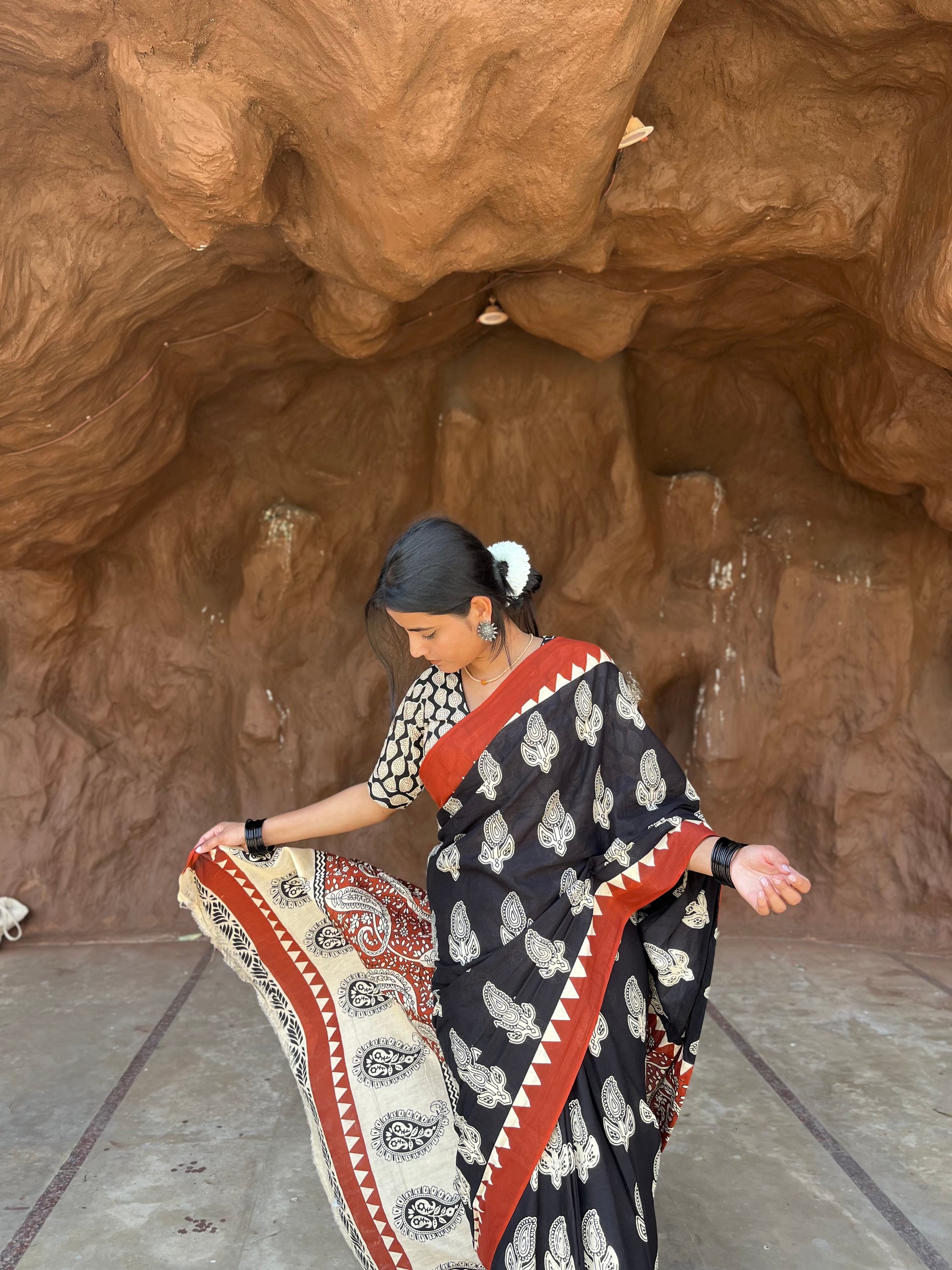 A striking blend of tradition and elegance, this black handblock-printed saree is a celebration of timeless artistry. The delicate white motifs contrast beautifully against the deep black fabric, creating a look that is both bold and graceful. The earthy rust-red border and intricately designed pallu add a rustic charm, making this saree perfect for those who love heritage weaves with a modern appeal.