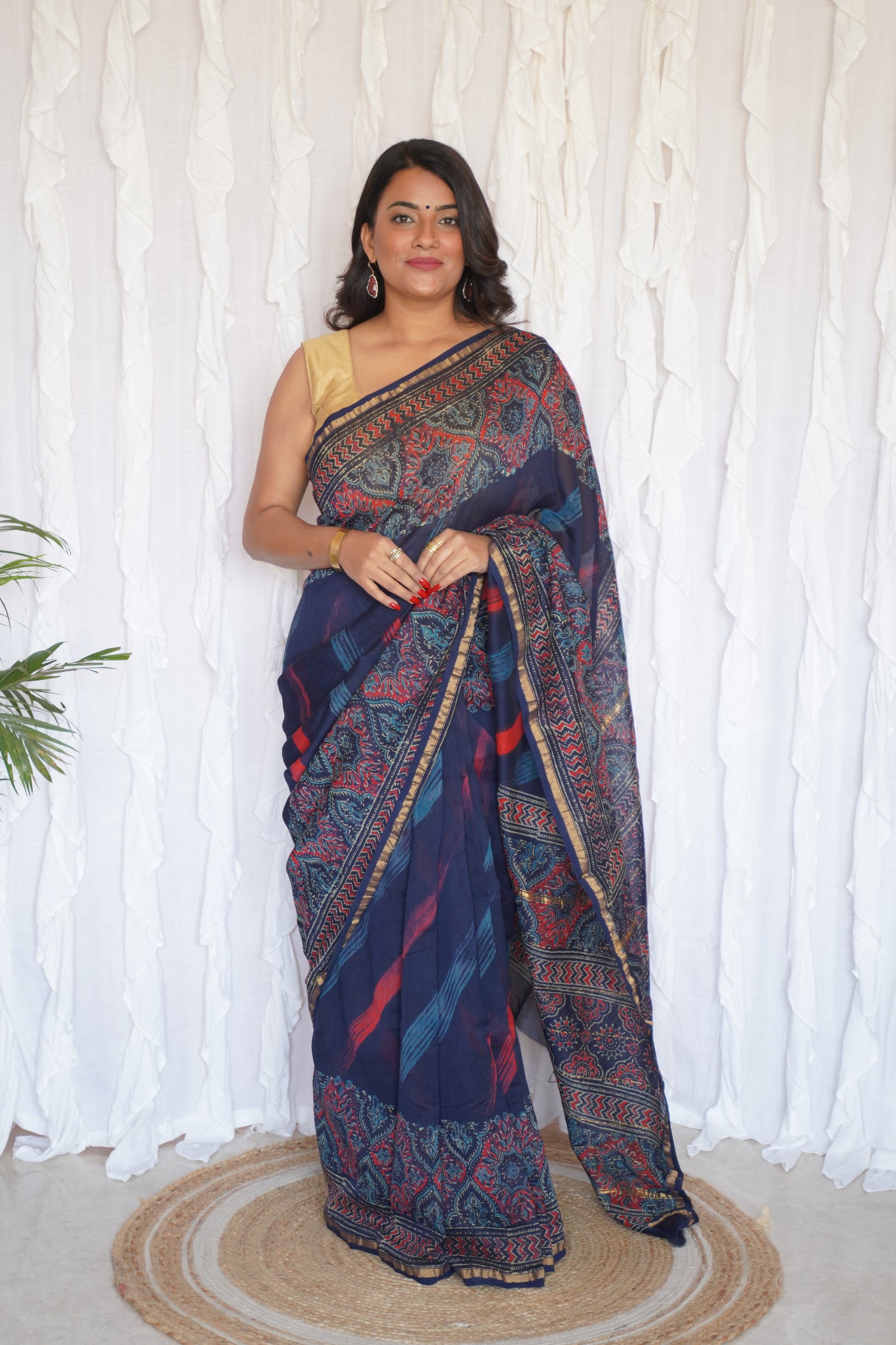 Discover timeless elegance with our Navy Blue and Crimson Red Cotton and Silk Chanderi Handblock Print Saree. Crafted in luxurious Cotton and Silk Chanderi fabric, its versatile length of 5.6 meters ensures graceful draping, complemented by a perfect height of 45 inches with the included blouse. The intricate handblock print on the canvas adds a touch of sophistication, making this saree a statement piece for every occasion. Paired with a complementary blouse, it seamlessly blends tradition with contemporary style, offering a refined and chic ensemble. Elevate your wardrobe with this exquisite saree that captures the essence of modern sophistication.
