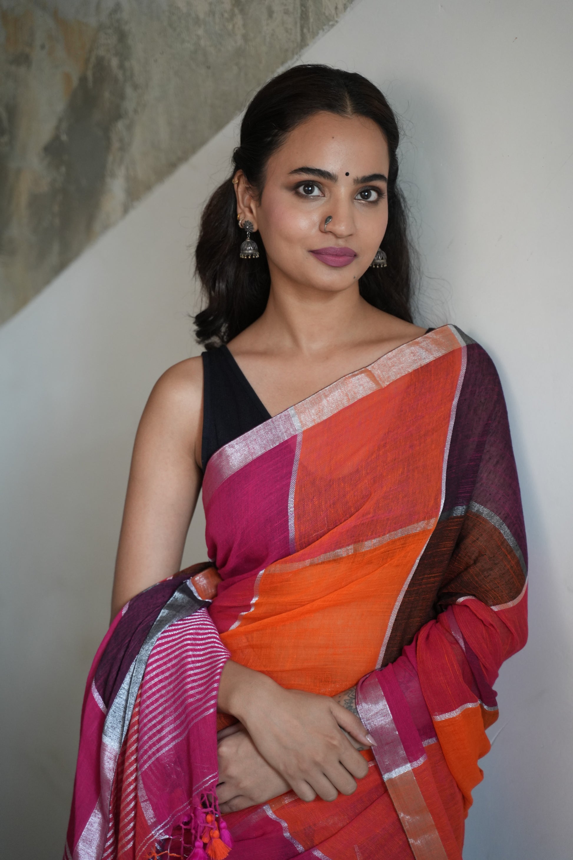 A lively handwoven saree featuring a striking checkered pattern in shades of hot pink, orange, rust, and black. Its bold palette makes it a statement piece, perfect for those who love colors that exude confidence and joy.
