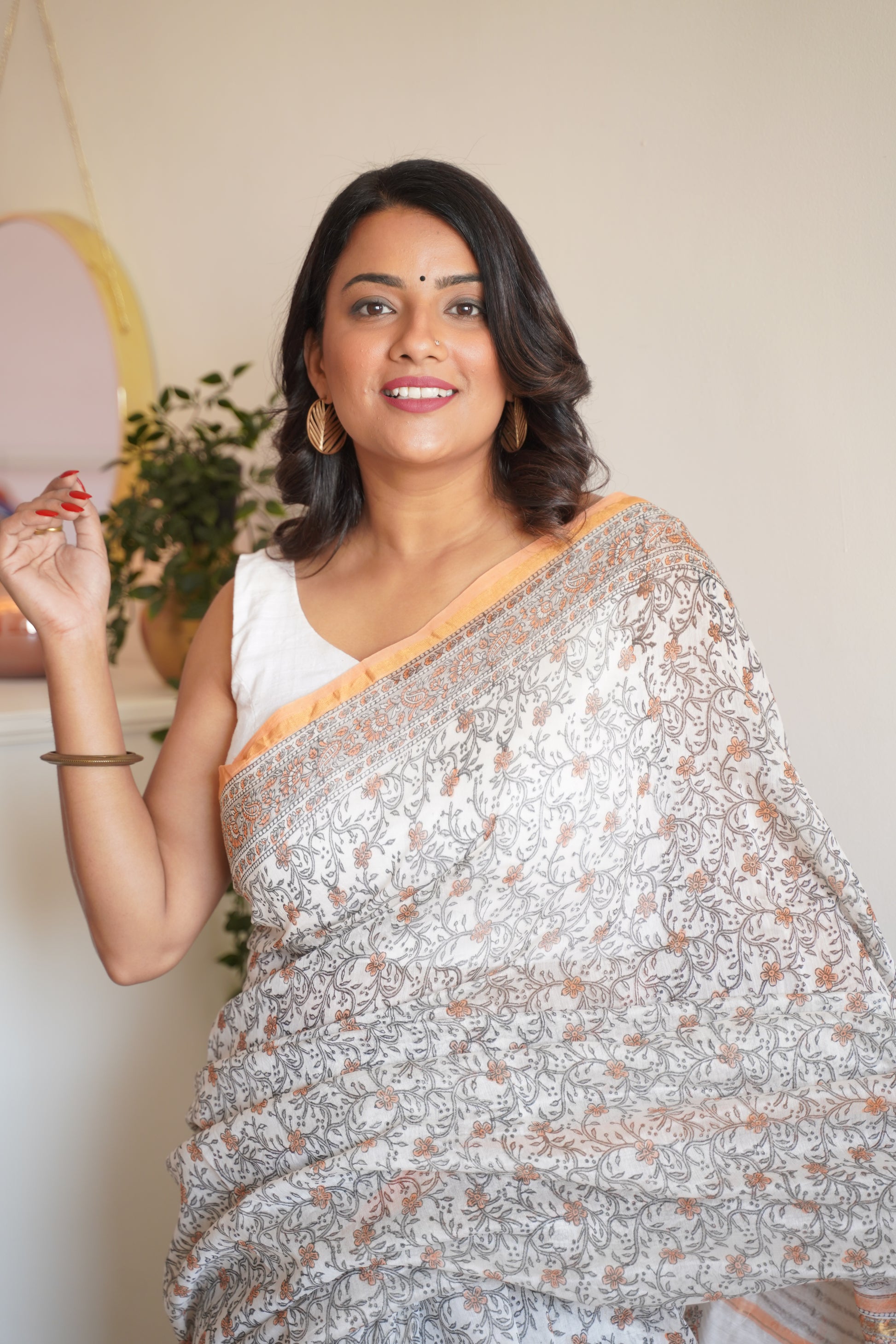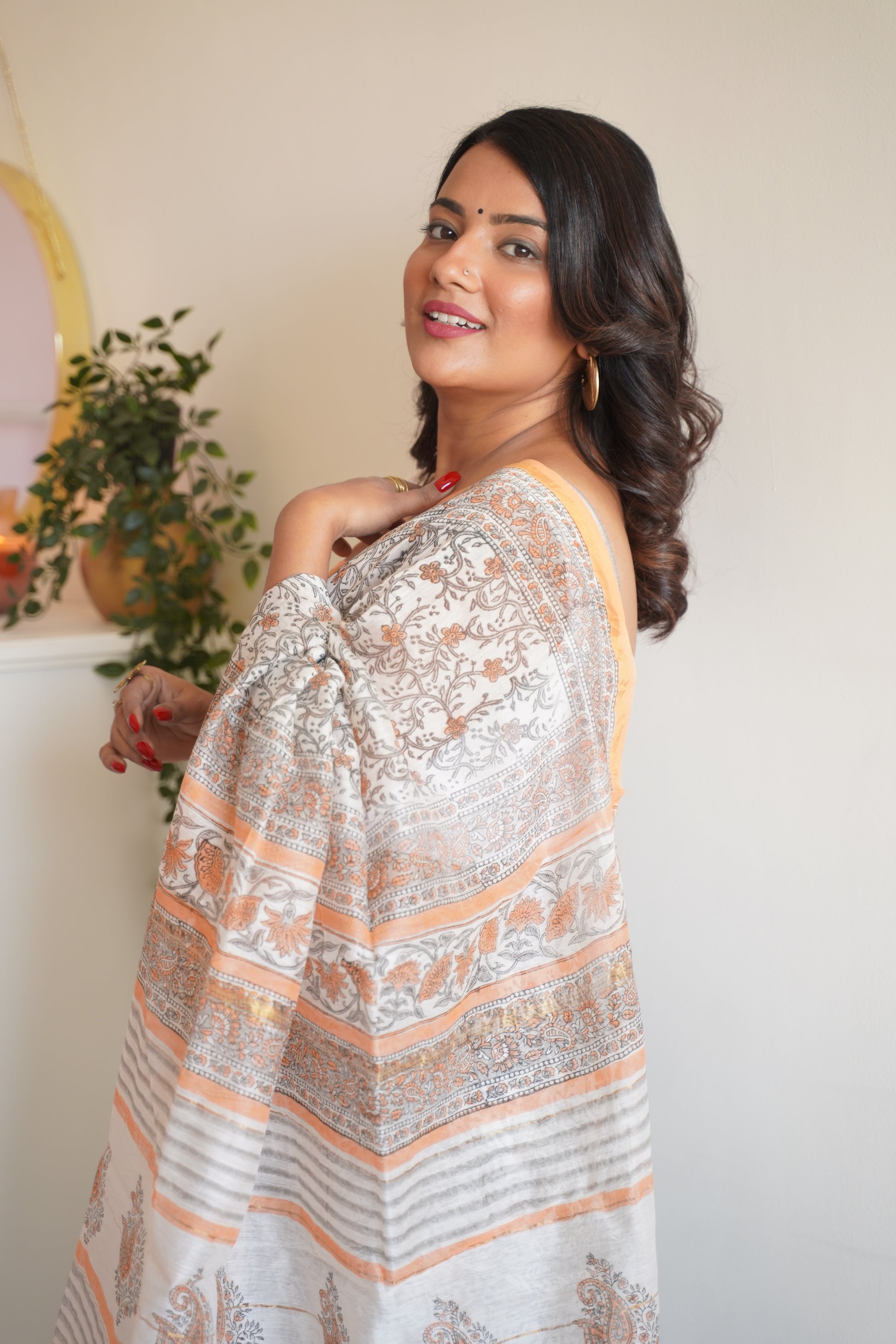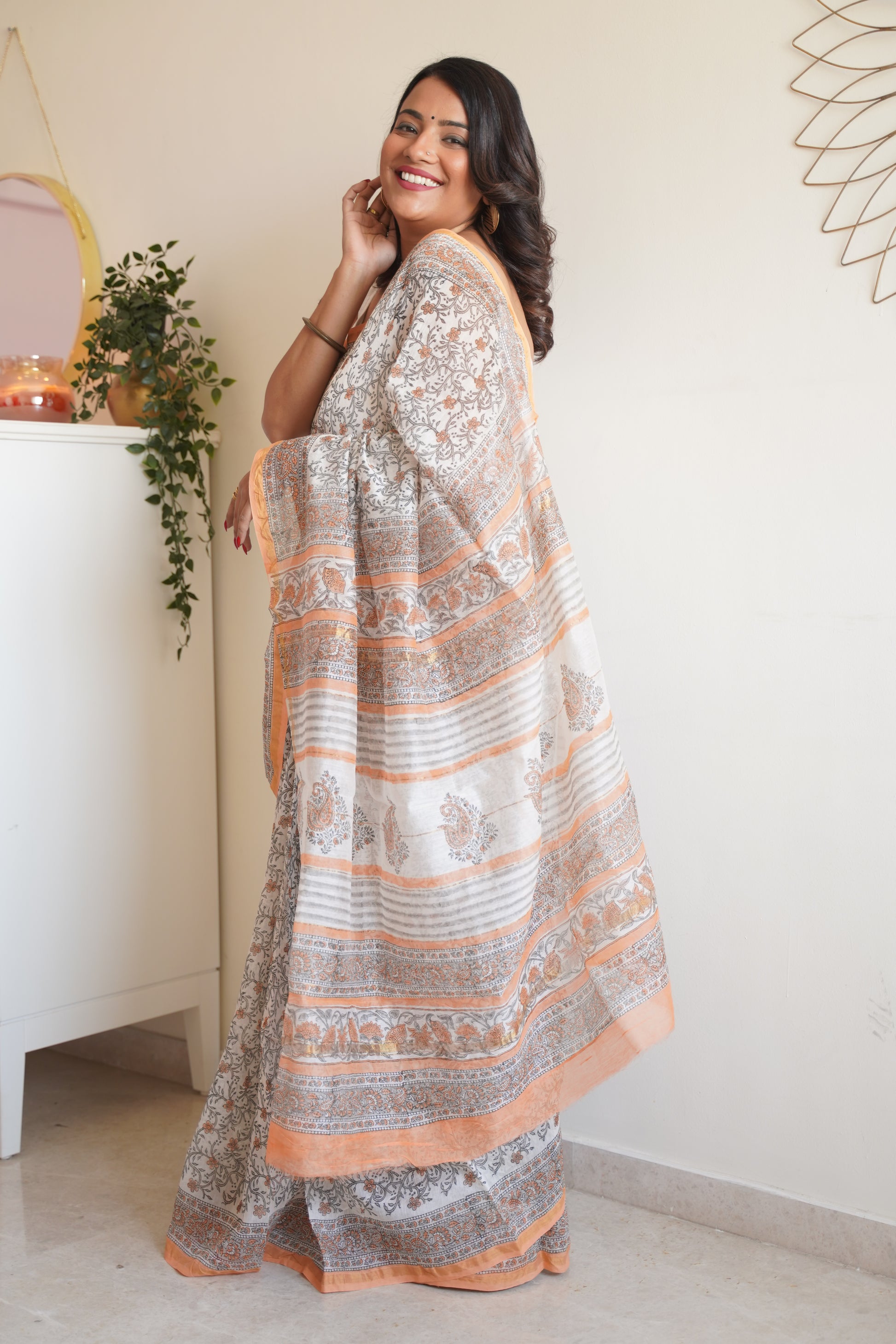 Off White and Light Salmon Border Cotton and Silk Chanderi Handblock Print Saree