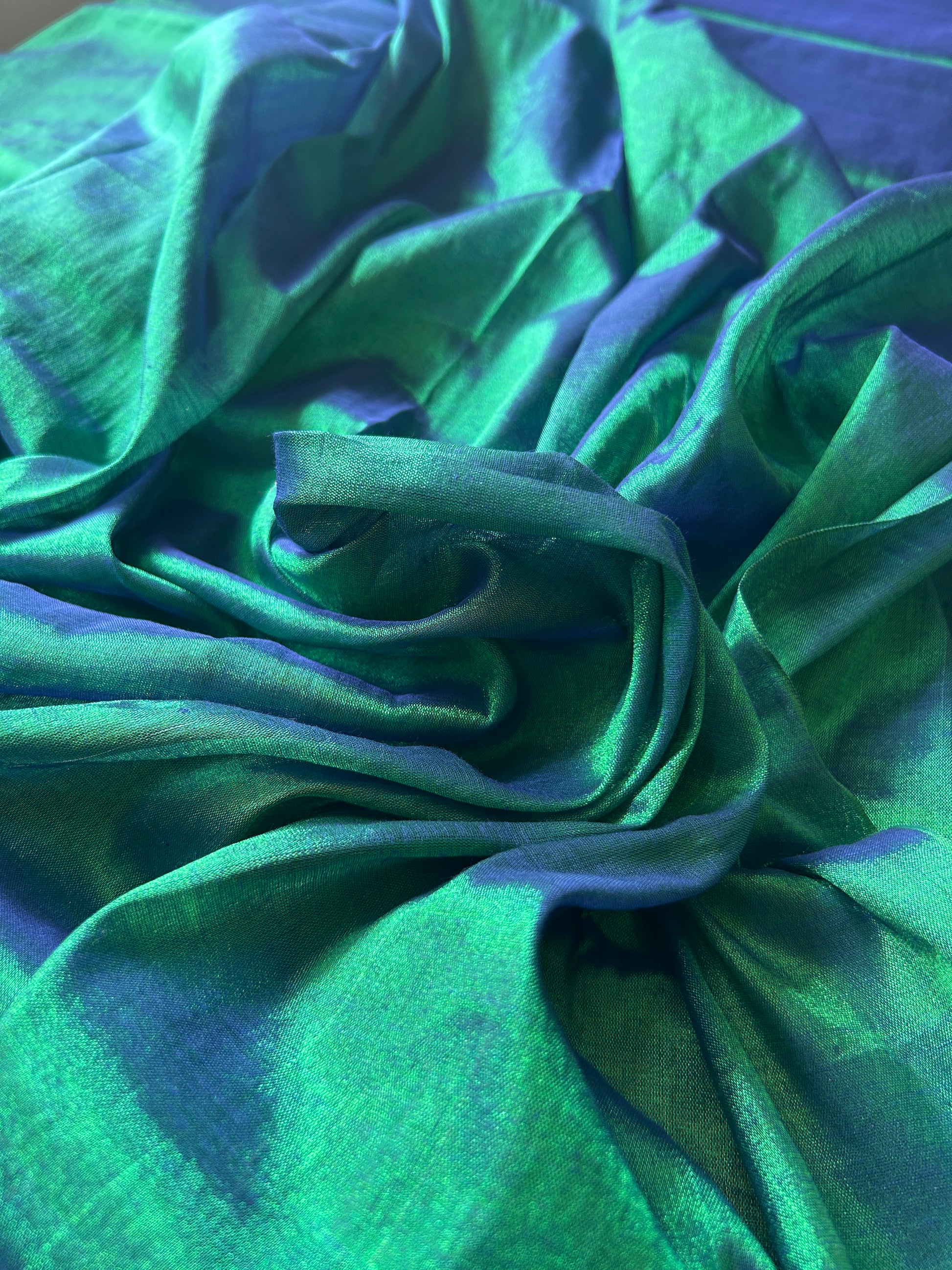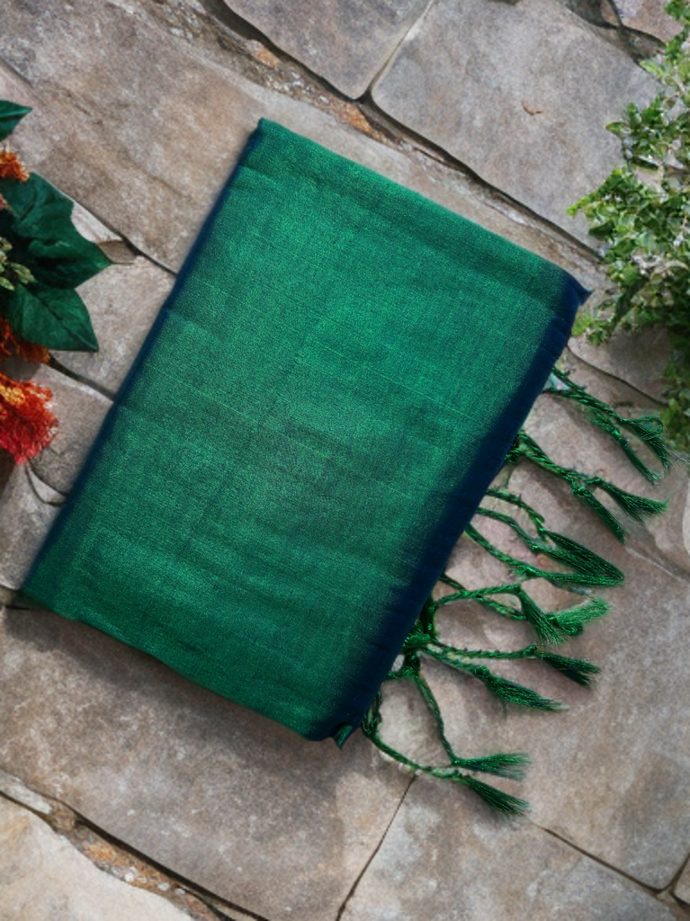 Drape yourself in the regal elegance of our Metallic Green with hints of teal and blue Cotton Tissue Saree, a celebration of simplicity and opulence. Crafted from the exquisite Cotton & Tissue fabric, this saree stands at 43 inches, offering a lightweight and graceful drape. With a length of 5.3 meters, the saree unfolds as a canvas of timeless sophistication. Paired with an 80 cm red plain running blouse, this ensemble is a seamless blend of classic charm and modern style. Care for this piece with a gentle dry wash to maintain its exquisite allure. Join our exclusive group and immerse yourself in the enduring charm of this resplendent creation.