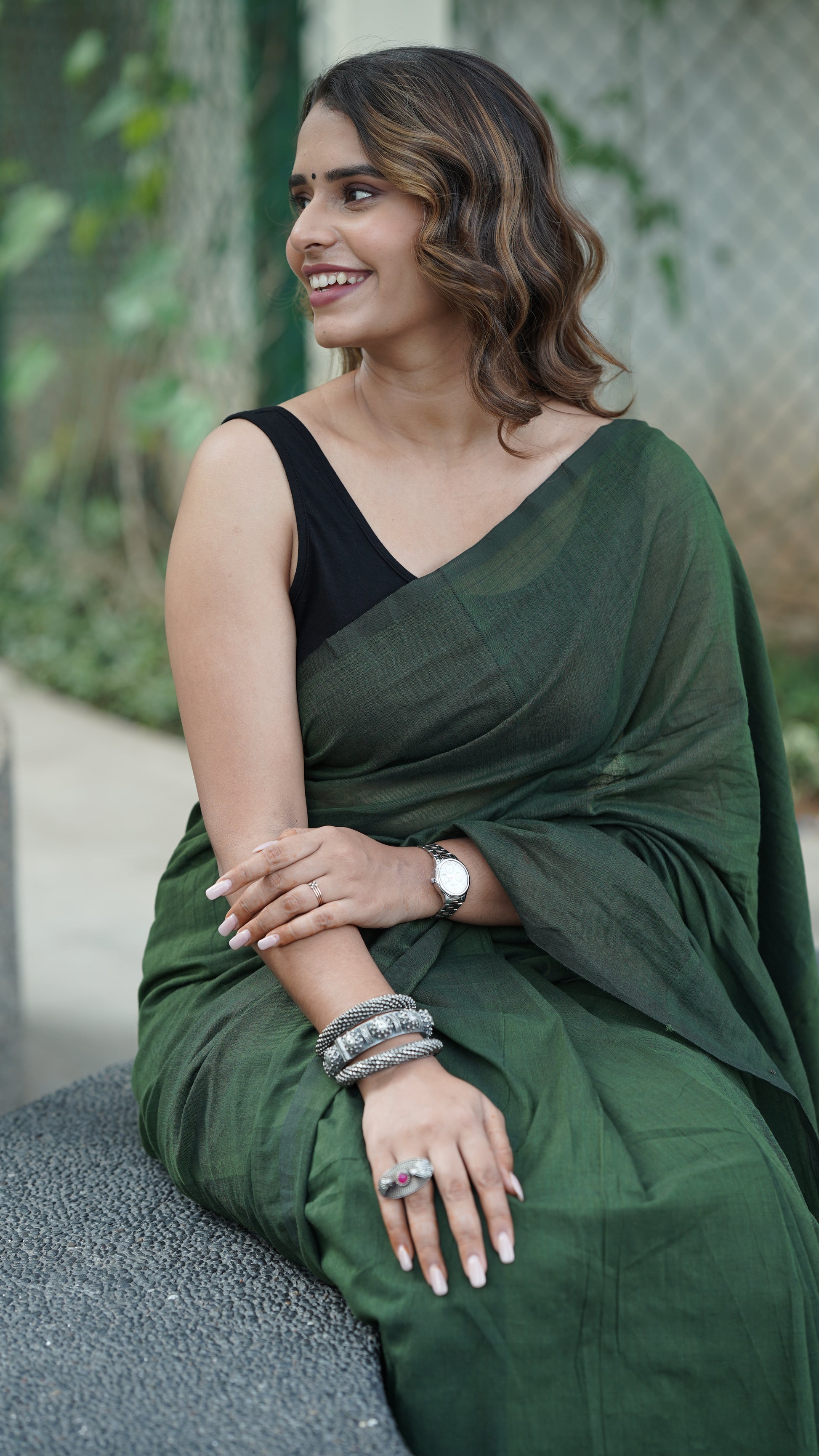 Drape yourself in the refreshing allure of our Pine Green Pure Cotton Saree, a celebration of simplicity and comfort. Woven from the finest Pure Cotton, this saree stands tall at 47 inches, offering a soft and graceful drape. With a length of 5.3 meters, the saree unfolds as a canvas of timeless sophistication. Paired with an 80 cm plain blouse, this ensemble is a seamless blend of classic charm and comfort. Care for this piece with a gentle handwash using cold water and mild detergent, preserving its pristine allure. Join our exclusive group and embrace the enduring elegance of this resplendent creation.