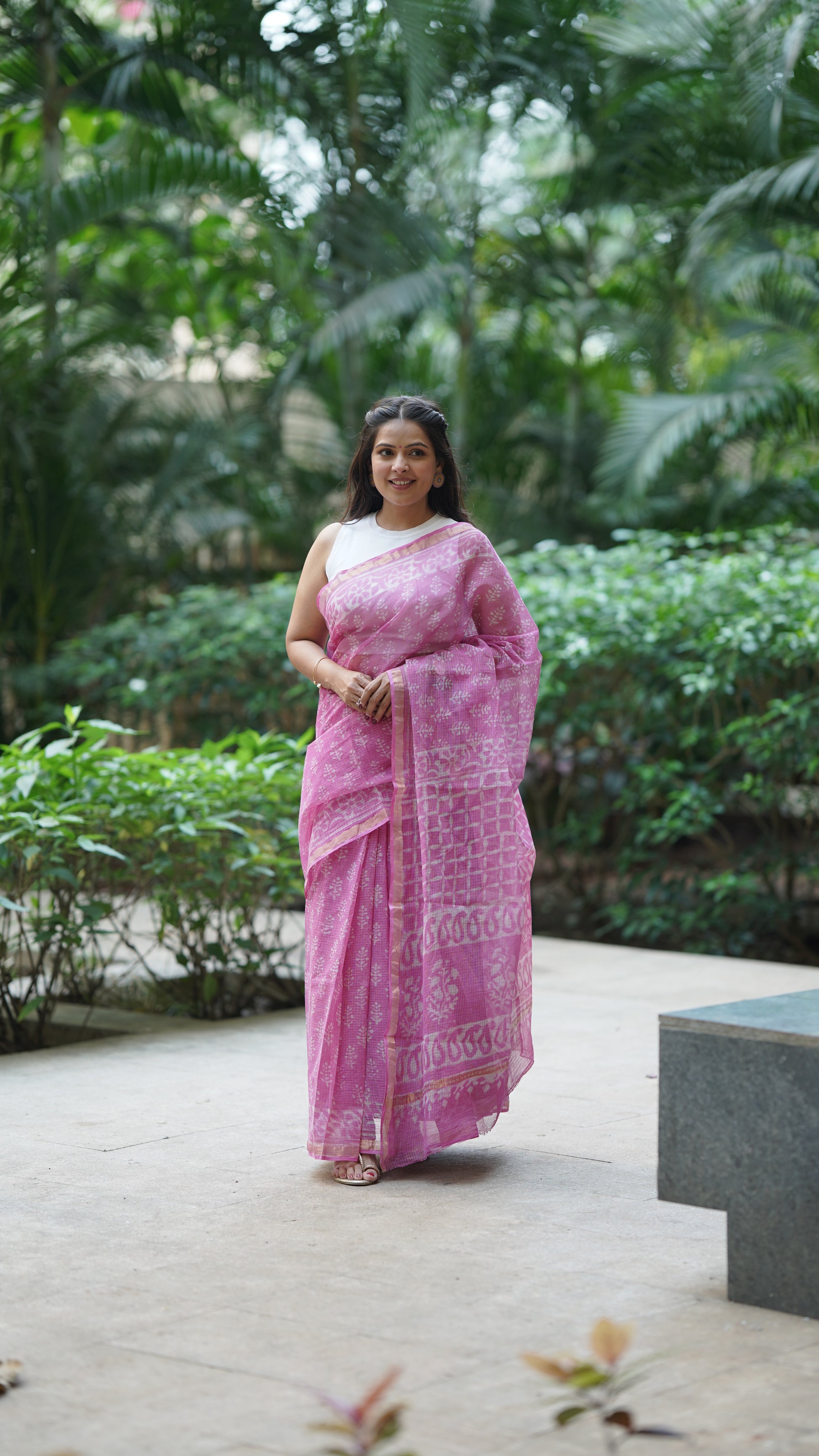 Pink Kota Doria Handblock Print Saree