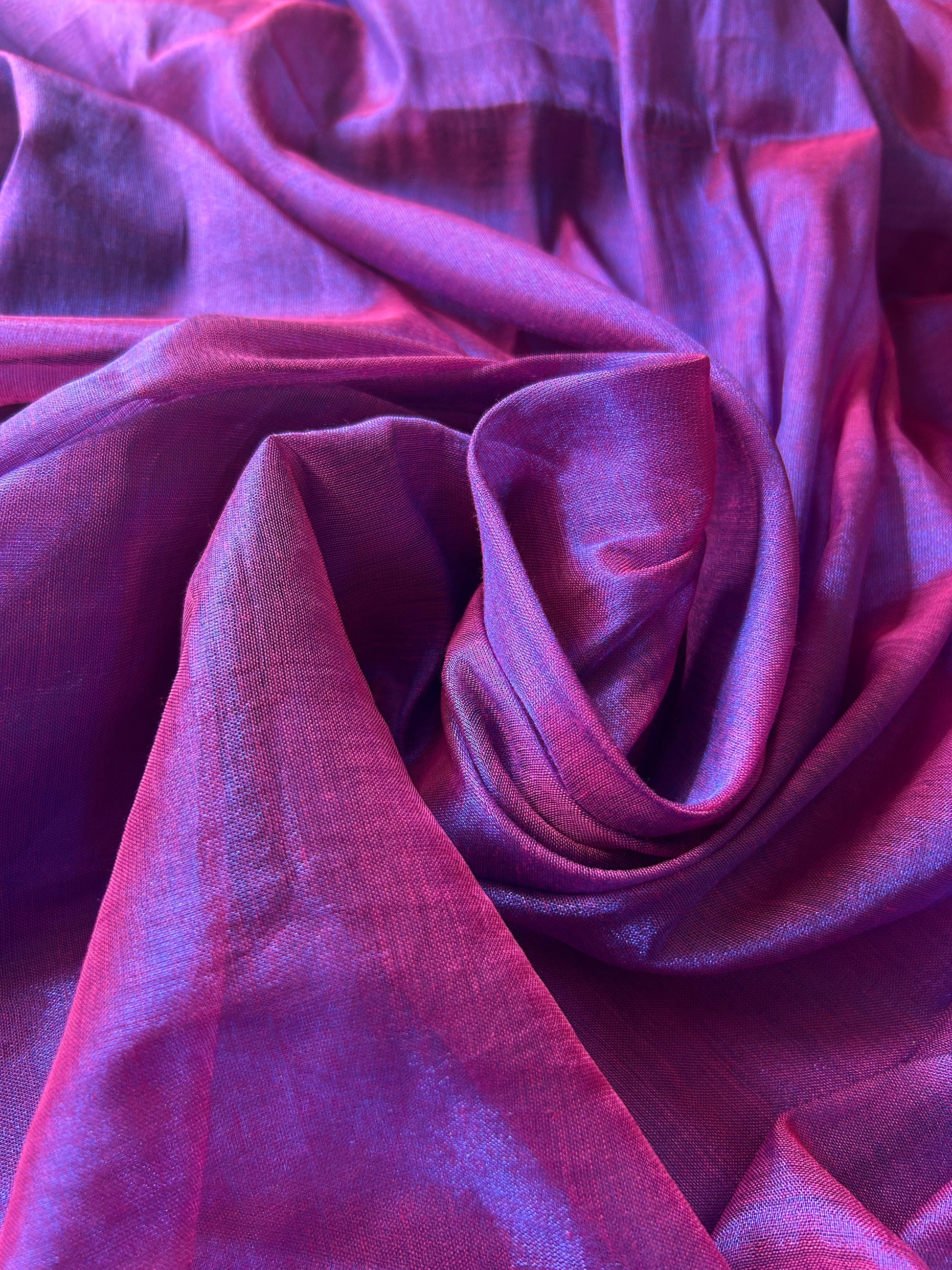 Drape yourself in the regal elegance of our Metallic deep plum, Violet, and metallic orchid blue Cotton Tissue Saree, a celebration of simplicity and opulence. Crafted from the exquisite Cotton & Tissue fabric, this saree stands at 43 inches, offering a lightweight and graceful drape. With a length of 5.3 meters, the saree unfolds as a canvas of timeless sophistication. Paired with an 80 cm red plain running blouse, this ensemble is a seamless blend of classic charm and modern style. Care for this piece with a gentle dry wash to maintain its exquisite allure. Join our exclusive group and immerse yourself in the enduring charm of this resplendent creation.