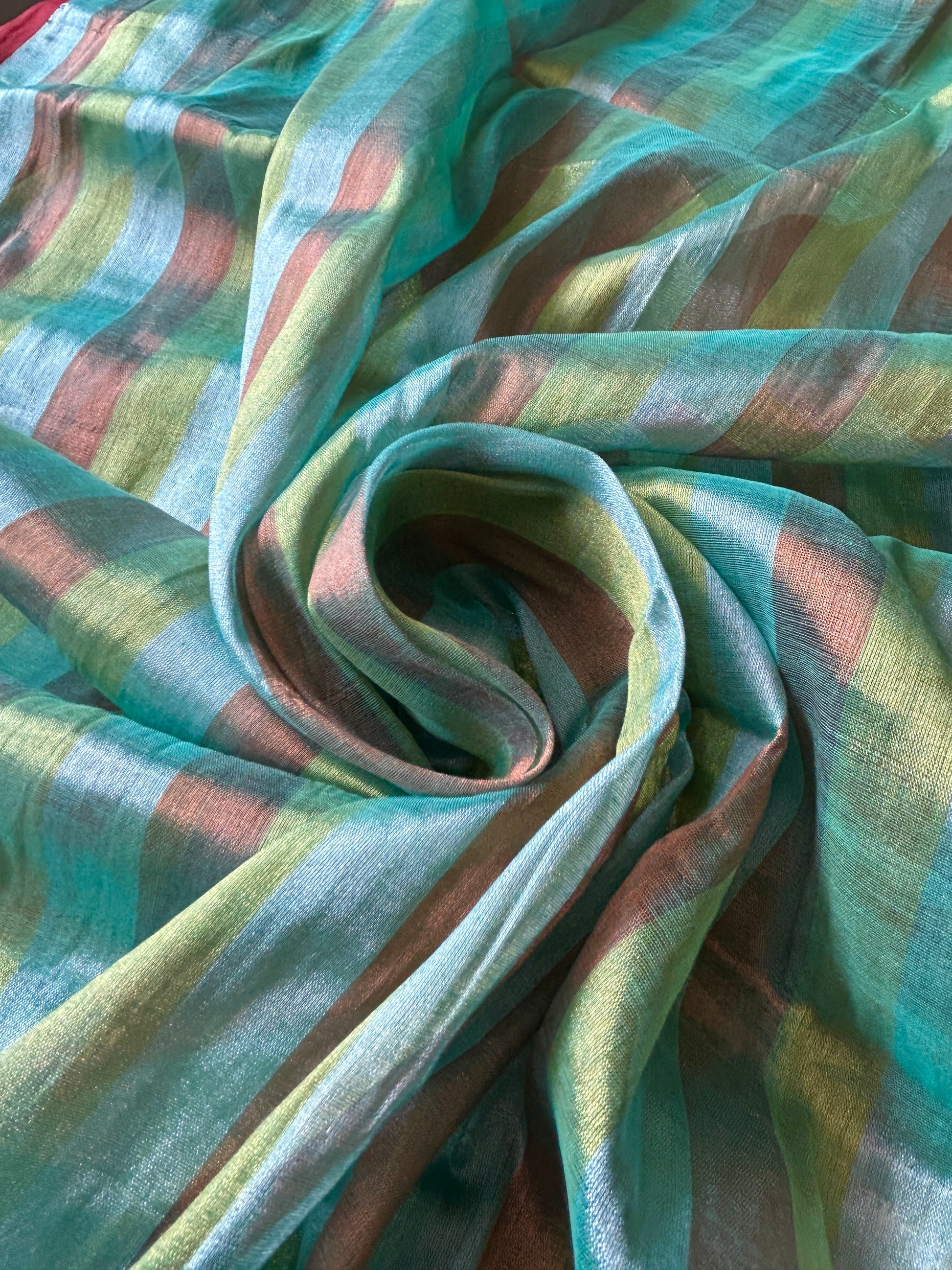 Drape yourself in shimmering grace with our Metallic Striped Aqua Olive Cotton Tissue Saree, where tradition meets contemporary charm. A luxurious play of Cool Teals, Serene Greens and earthy olive tones woven into delicate metallic Stripes, this saree celebrates understated opulence with a modern twist. Woven from a delicate blend of Cotton and Tissue, it offers a lightweight, airy drape with a subtle sheen that catches the light with every move. Measuring 43 inches in height and 5.3 meters in length, it gracefully envelopes you in effortless elegance.This saree is paired with an 80 cm running blouse, allowing you to style it your way — whether classic or experimental. Perfect for festive gatherings, intimate soirees, or serene day functions, this striped beauty is as versatile as it is striking.