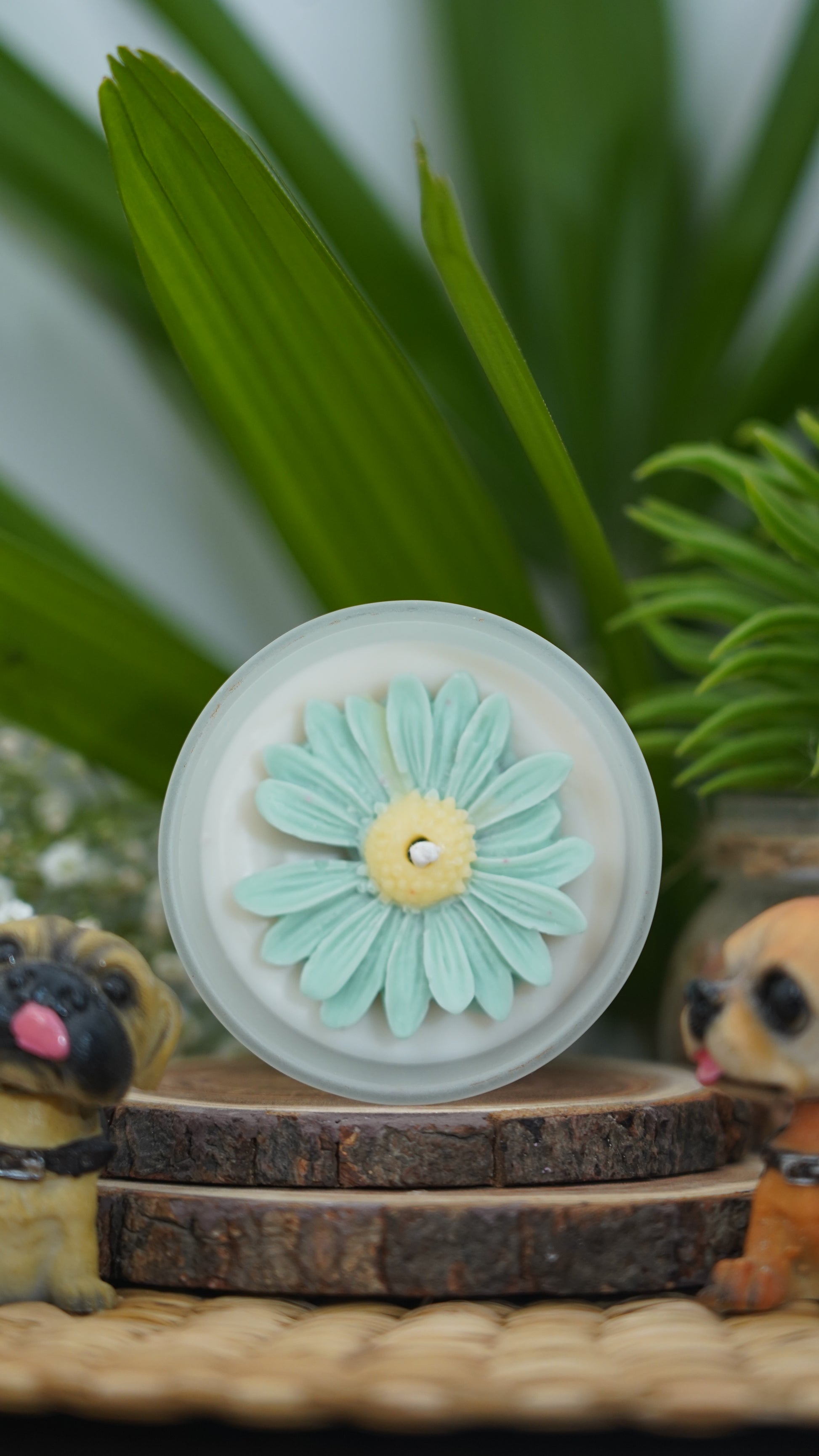 This candle is topped with a beautiful scented seafoam green flower accent to enhance the beauty of your home.