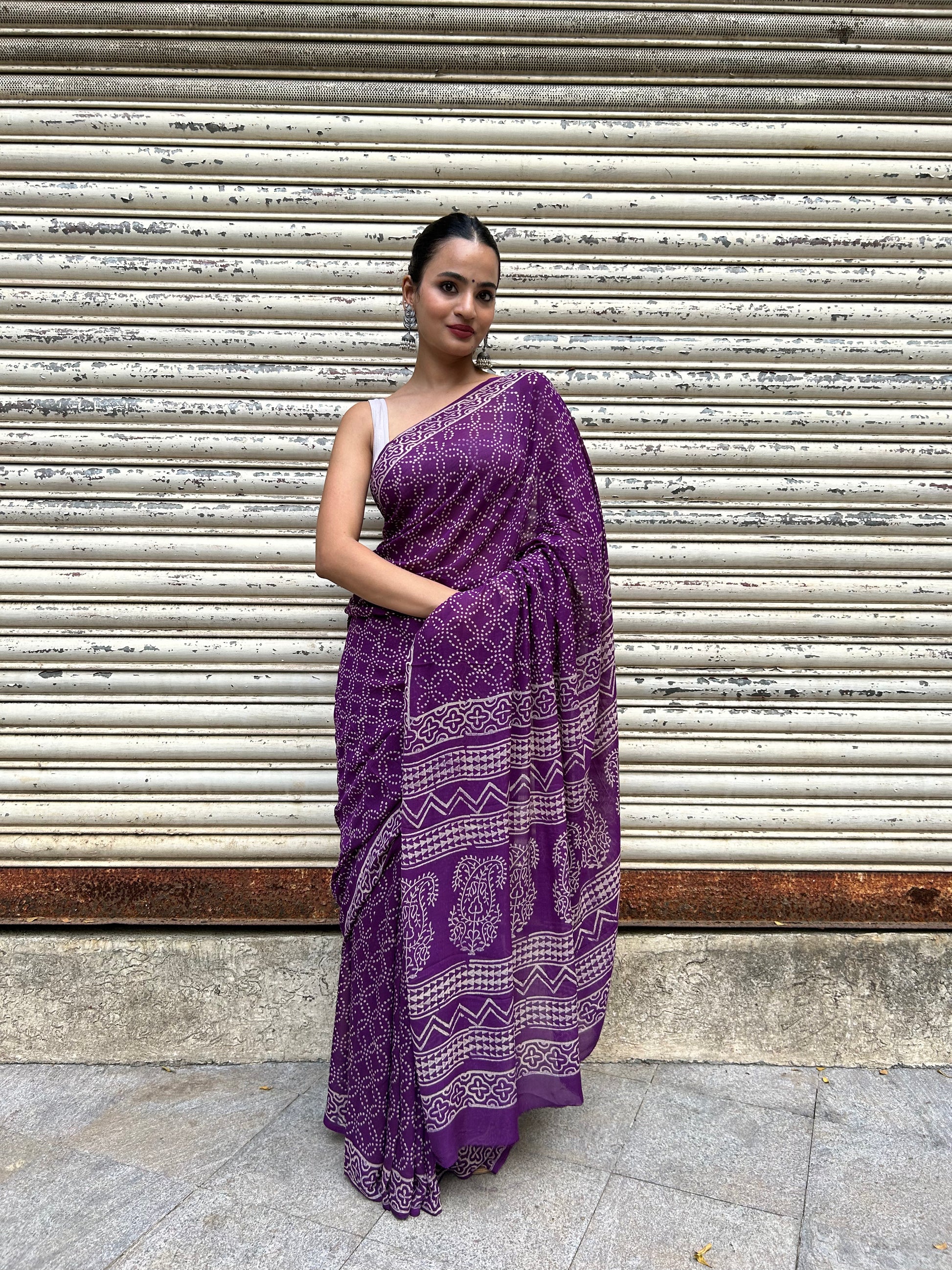 Drape yourself in the enchanting beauty of our Violet Chiffon Block Print Saree, a symphony of elegance and grace. Woven from exquisite Chiffon, this saree stands at a majestic 48 inches, offering a regal and lightweight drape. The Block Print work, intricately designed, adds a touch of artisanal charm, creating a visual masterpiece on the fabric. With a length of 5.6 meters, the saree unfolds a tale of tradition and modernity. Paired with an 80 cm Plain Blouse with Border, this ensemble is a celebration of seamless beauty and style. Join our exclusive group and immerse yourself in the timeless allure of this resplendent creation, where every thread tells a story of sophistication and elegance.