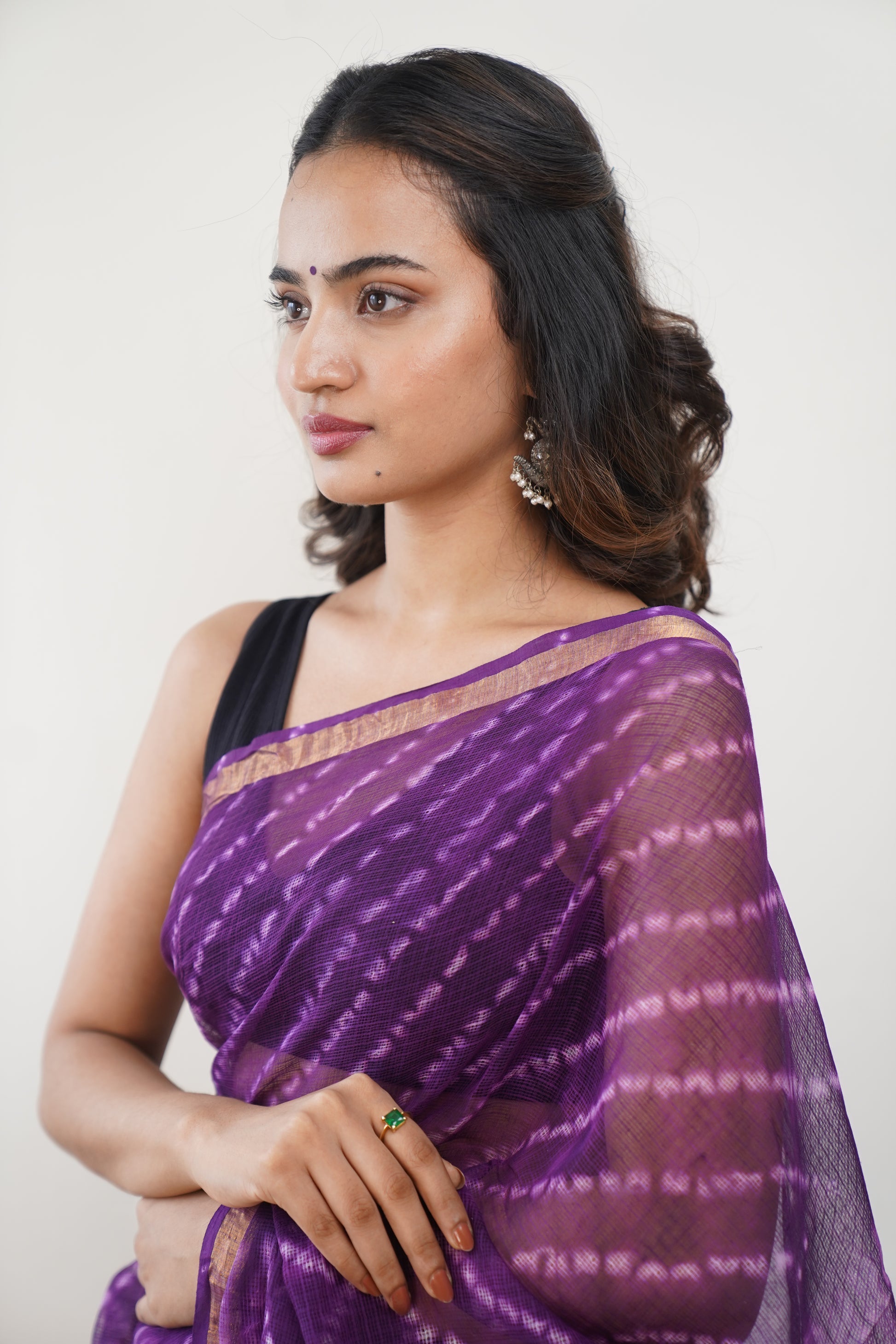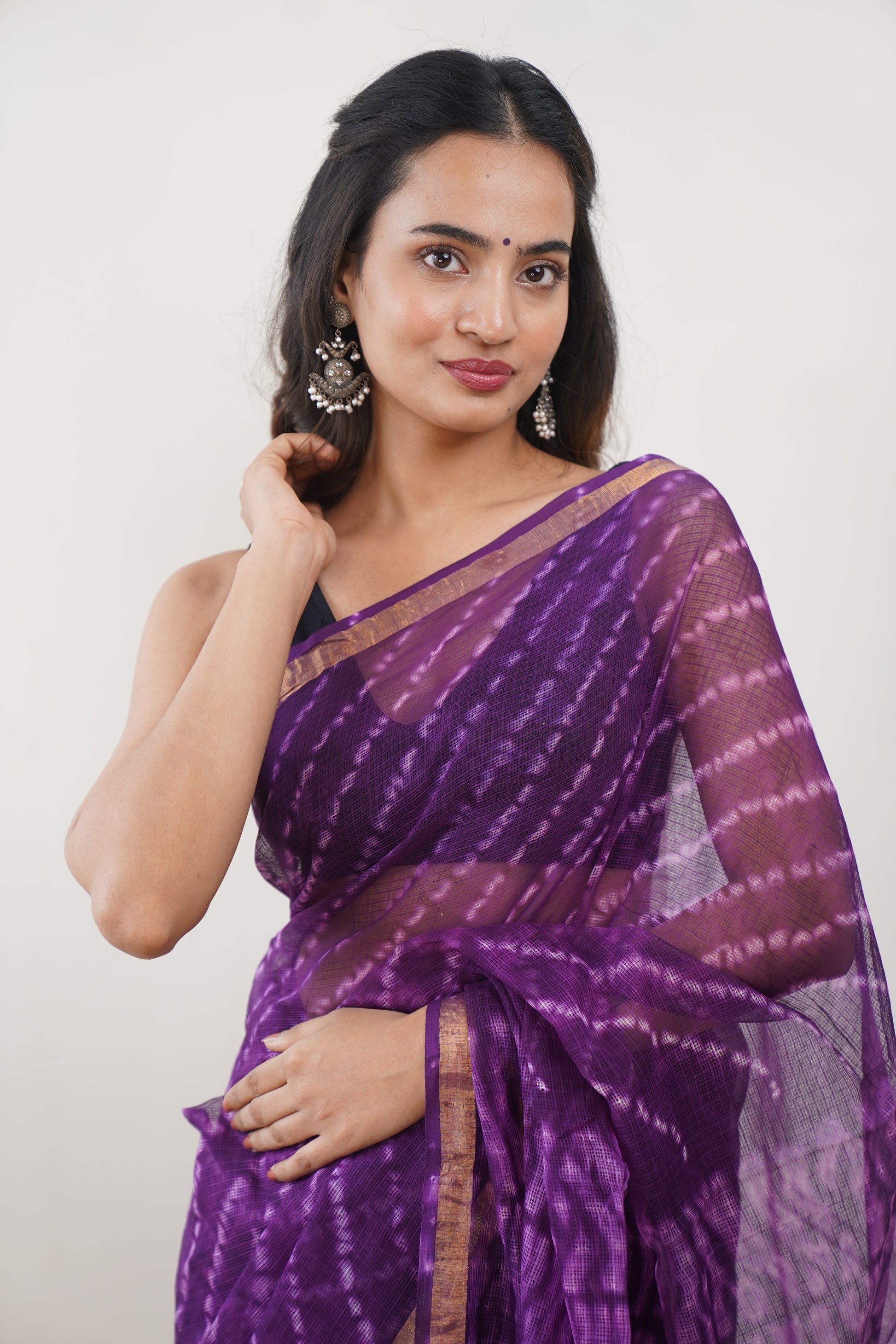 Adorn yourself in the refreshing hues of our Kota Doria Shibori Print Saree, a captivating fusion of tradition and modernity. Woven from the delicate Kota Doria fabric, this saree stands at 44 inches, offering a light and graceful drape. The shibori print work, skillfully executed, adds a touch of contemporary flair, creating a visual symphony on the fabric. The Zari Border enhances the opulence of the ensemble. With a length of 5.3 meters, the saree unfolds as a canvas of enduring beauty. Paired with a 87 cm plain blouse, this ensemble is a seamless blend of classic charm and modern style. Preserve the exquisite allure of this piece with a gentle dry wash. Join our exclusive group and immerse yourself in the enduring charm of this resplendent creation.