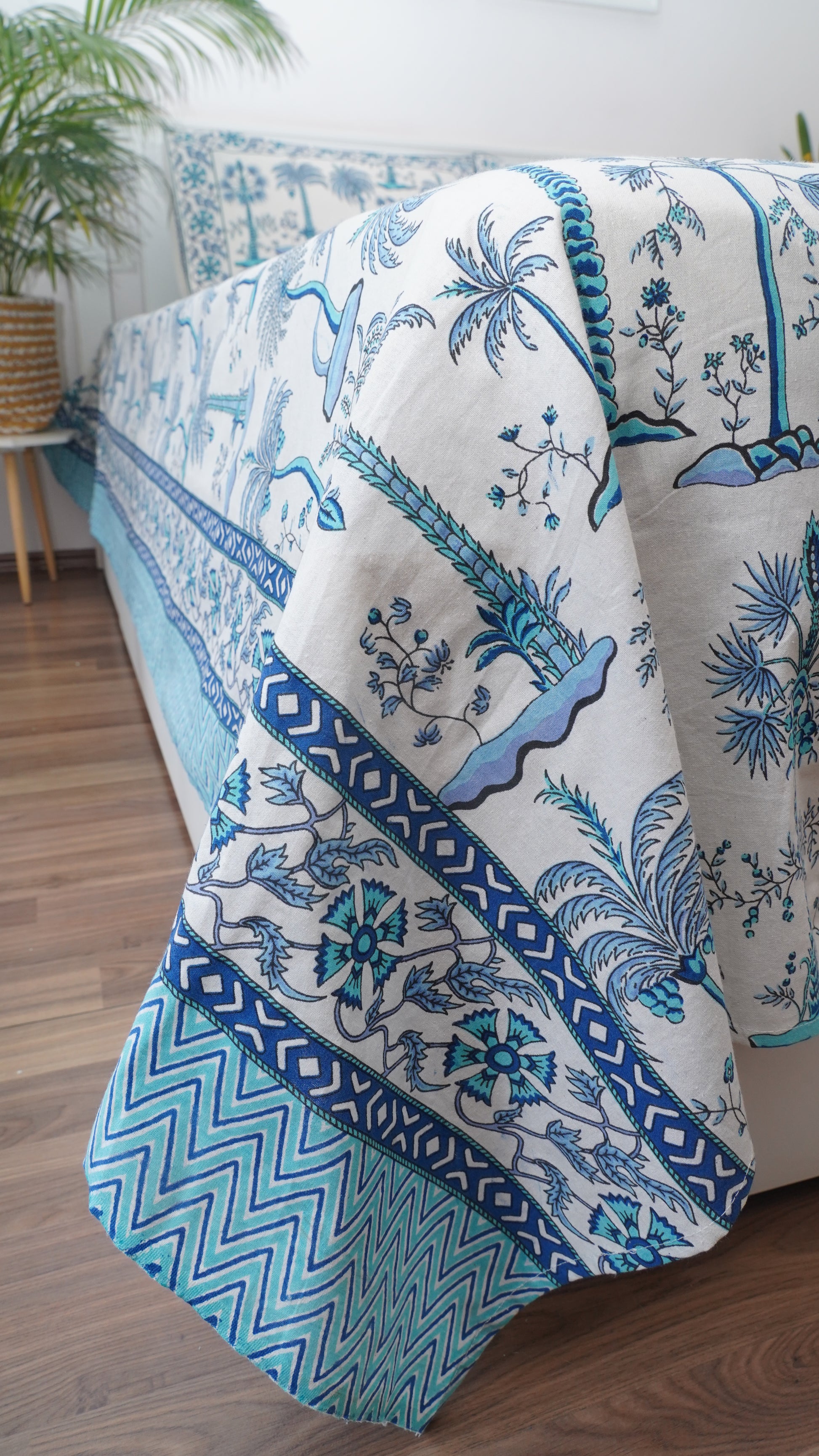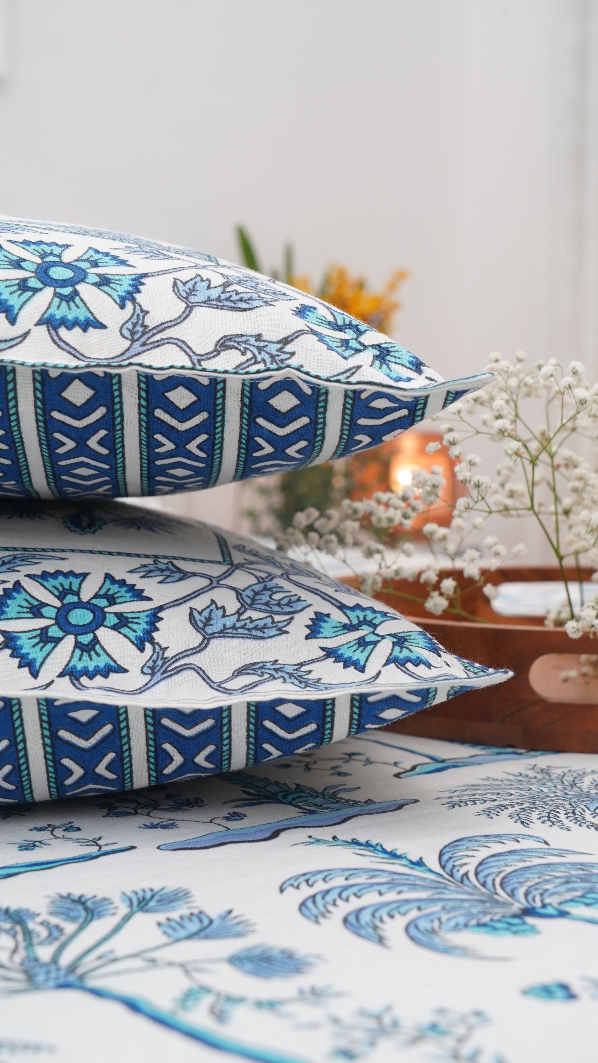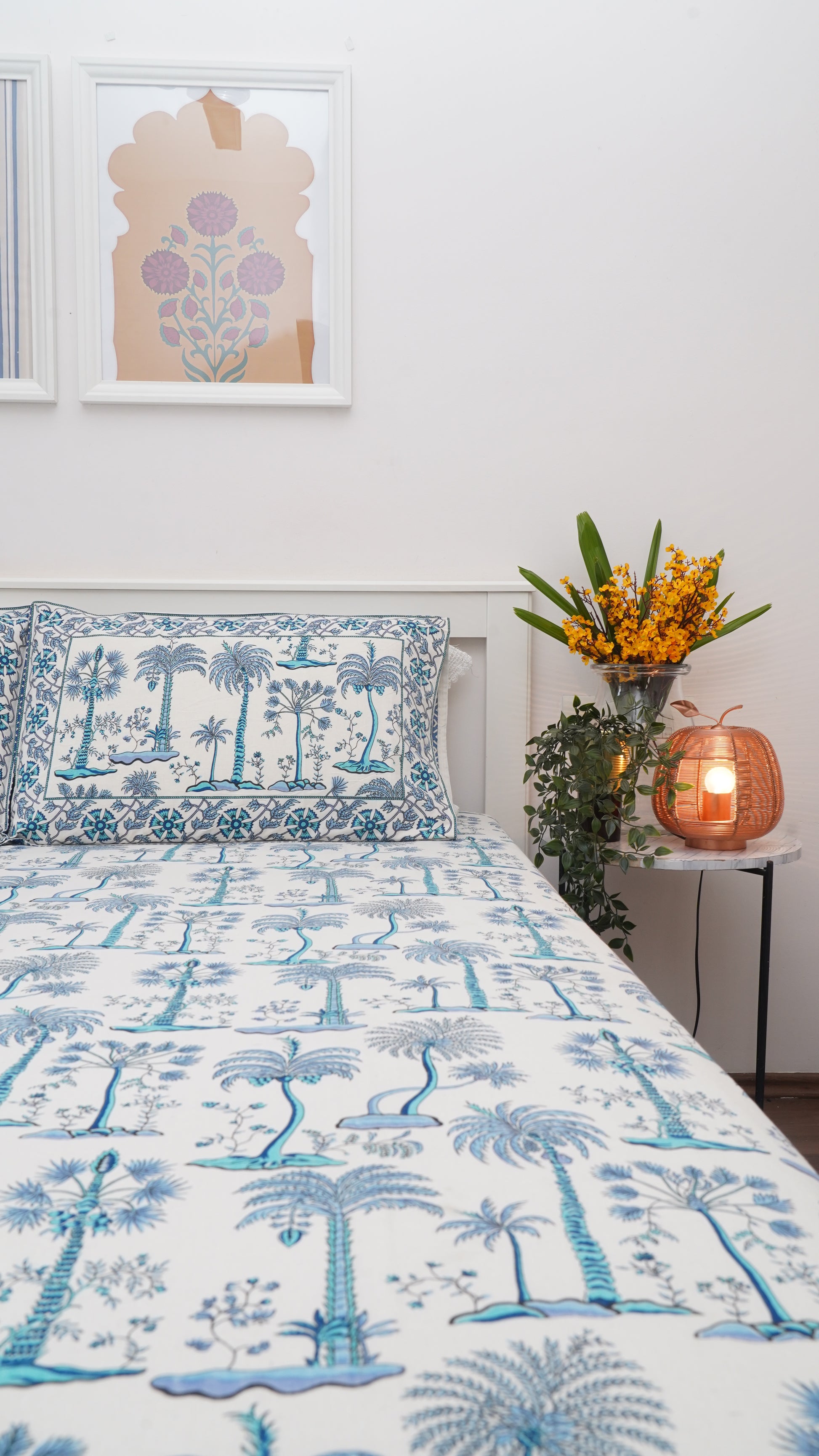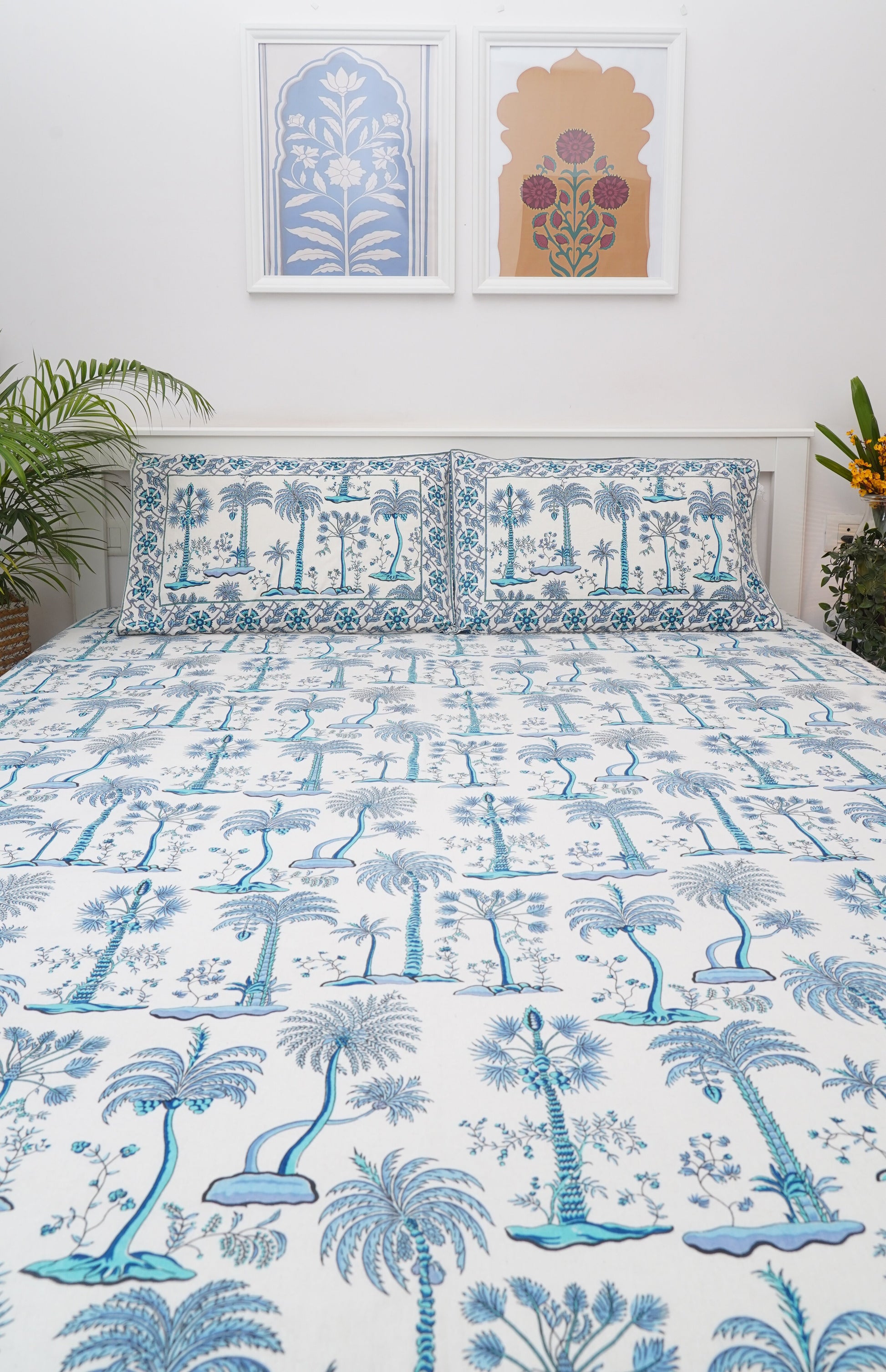 Nucifera- White & Blue King Size 100% Cotton Handblock Print Bedsheet