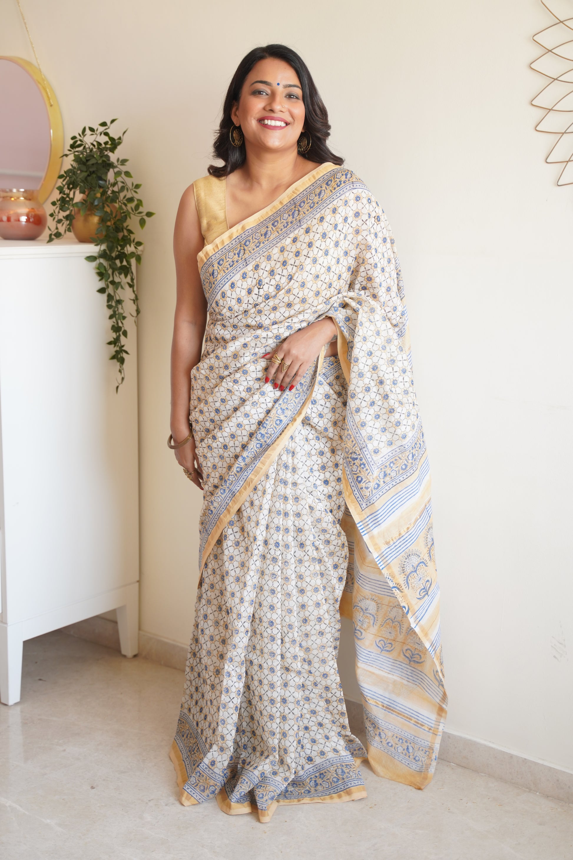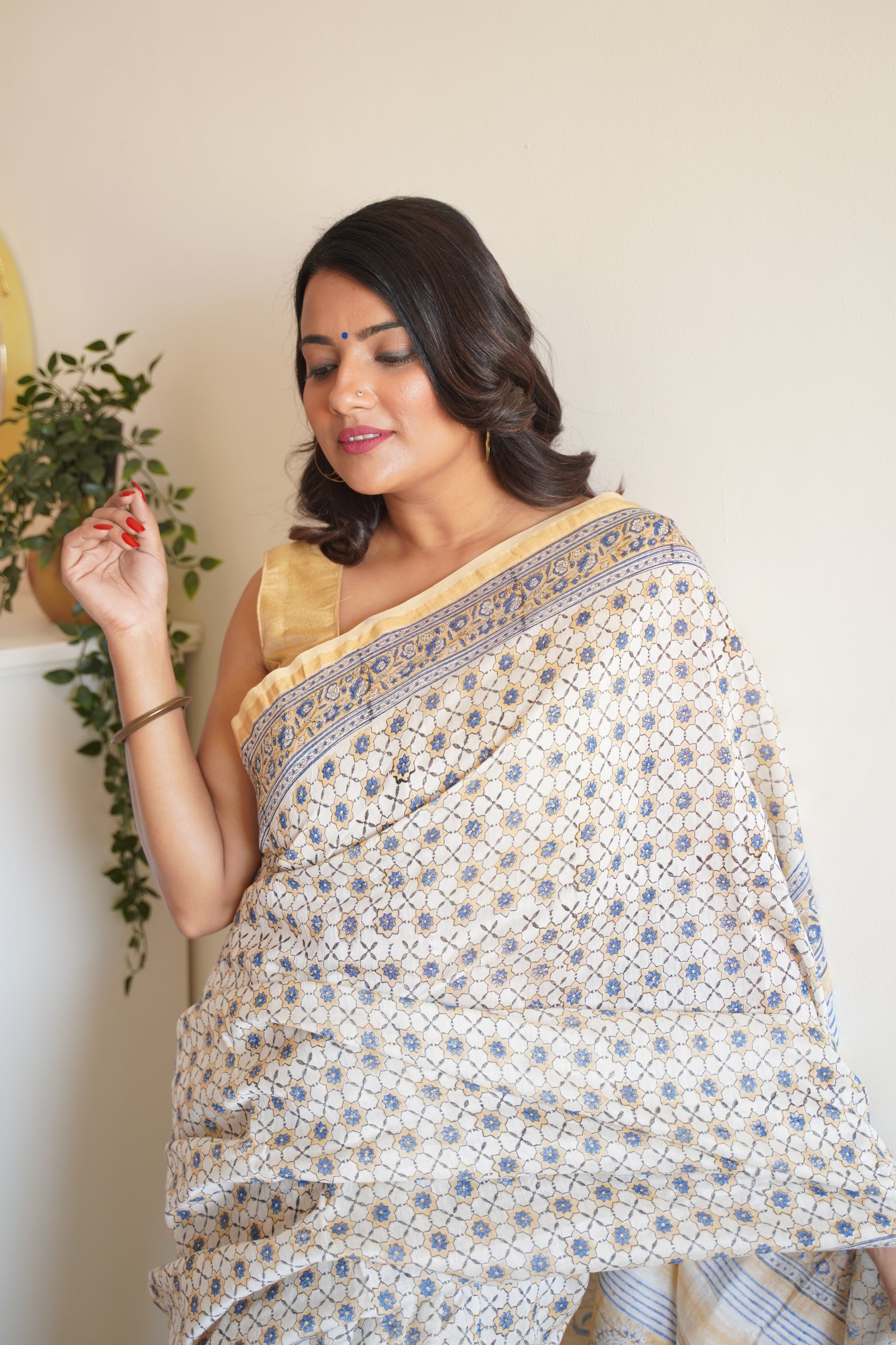 White and Light Caramel Cotton and Silk Chanderi Handblock Print Saree