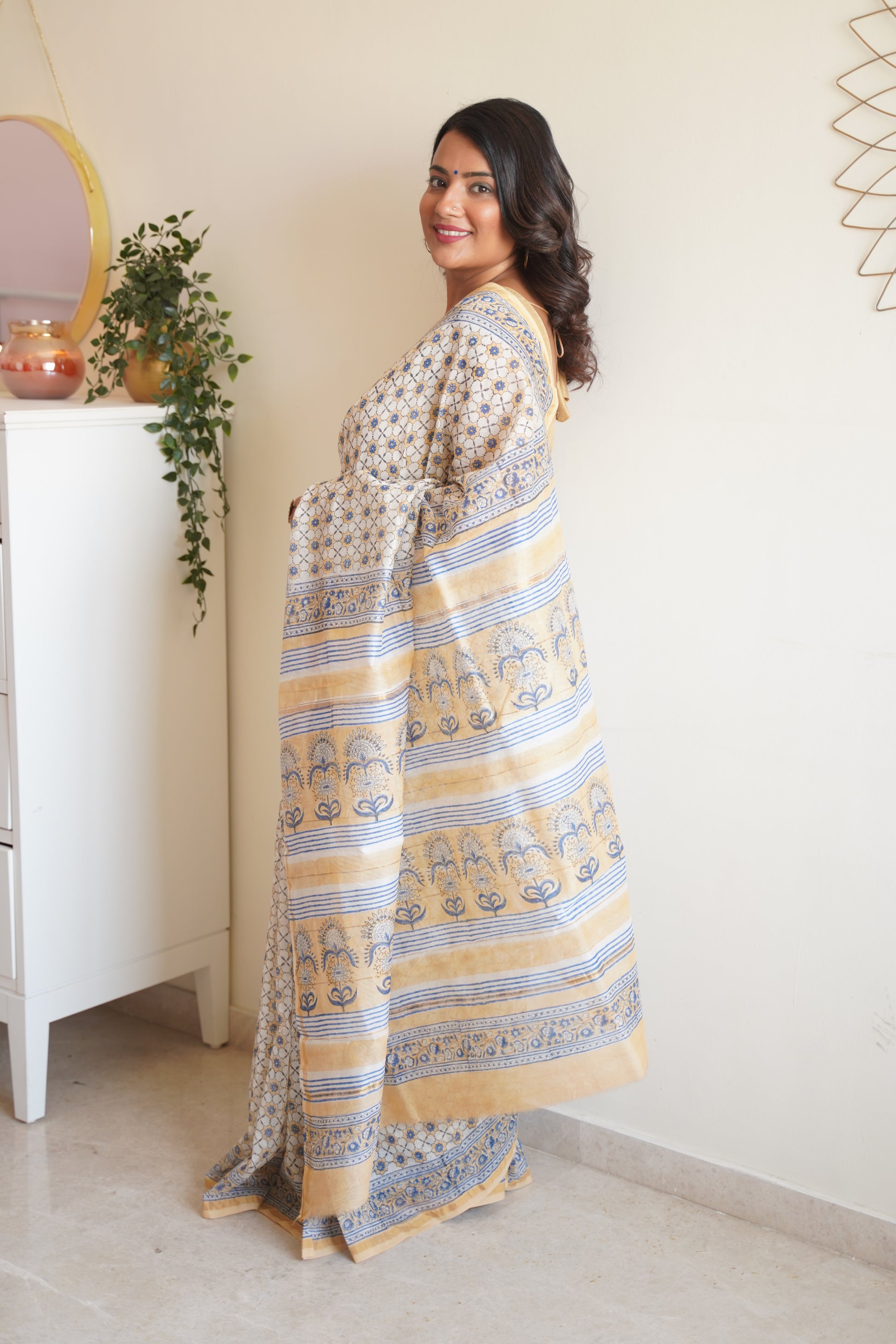 Note: It's a handblock printed saree all done by artisans. There might be slight irregularities in the print, motif, or colour. These are not defects, it's the nature of handicraft products.