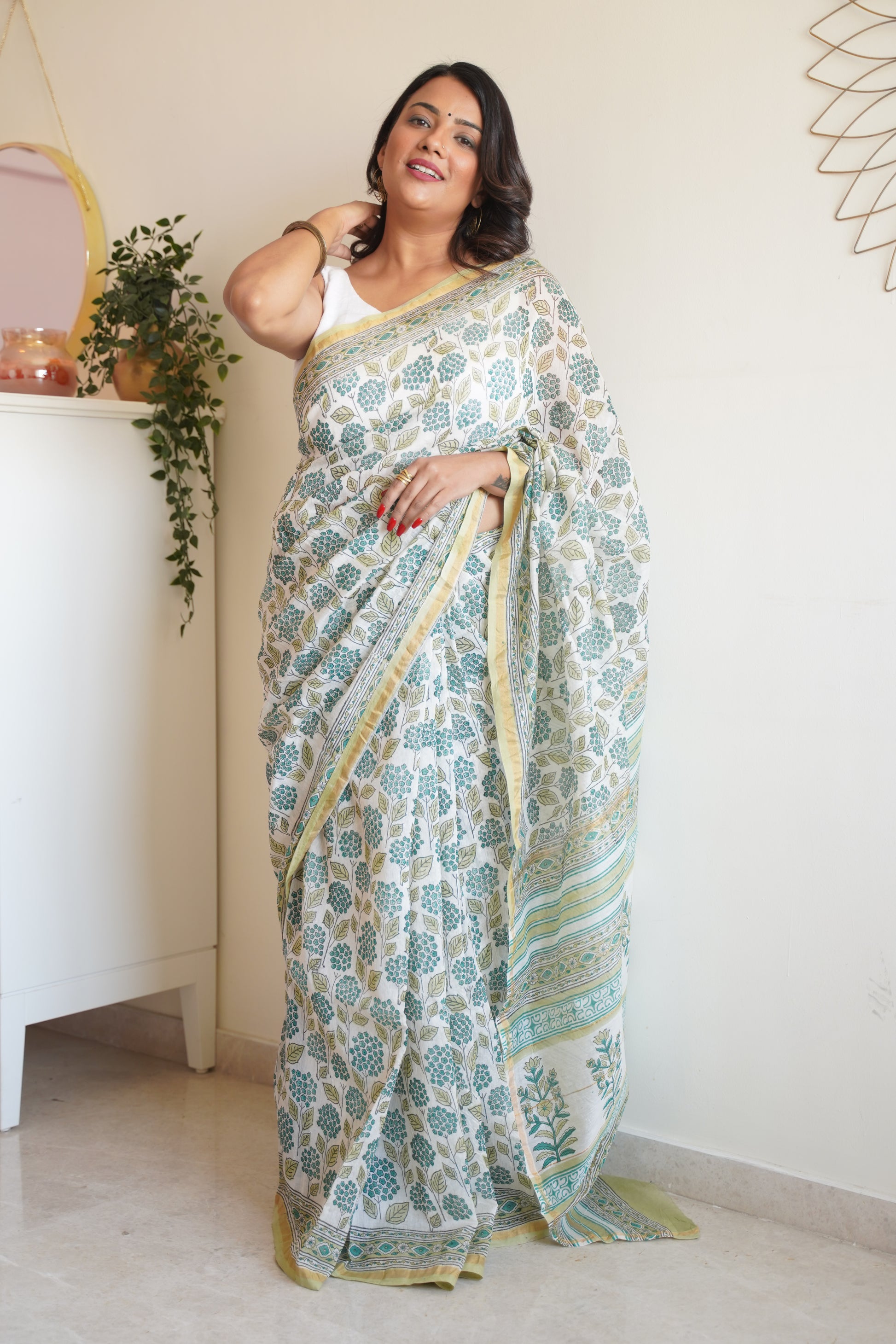 White and Teal Cotton and Silk Chanderi Handblock Print Saree